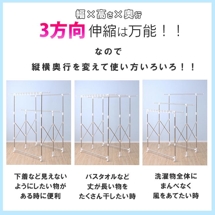 干す物、場所に合わせて幅・奥行き・高さが伸縮できます。