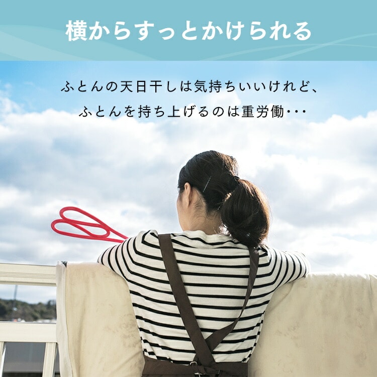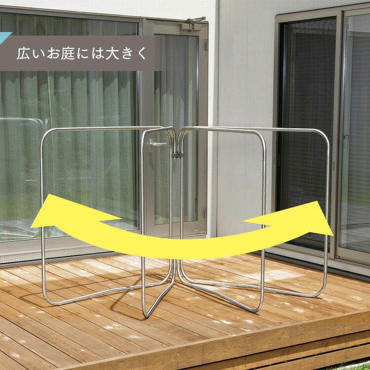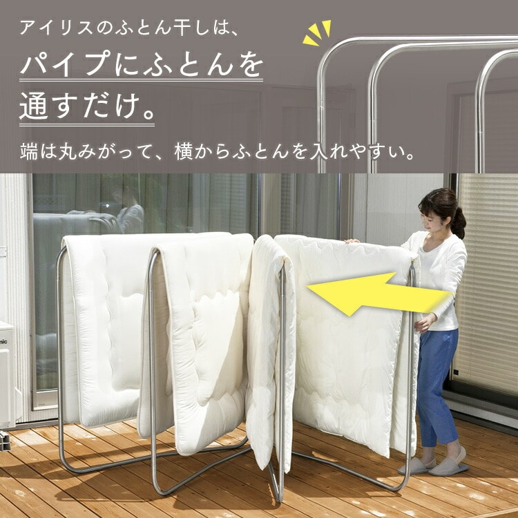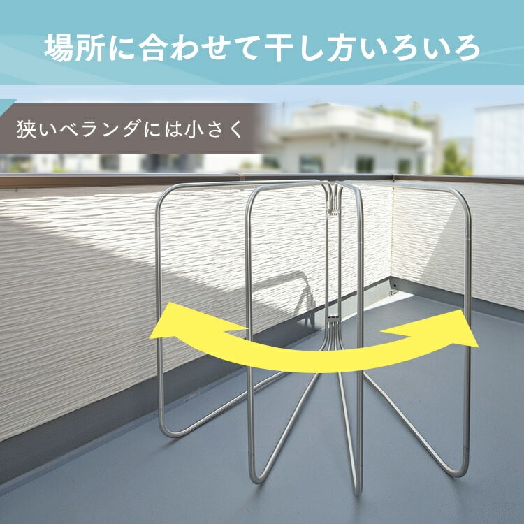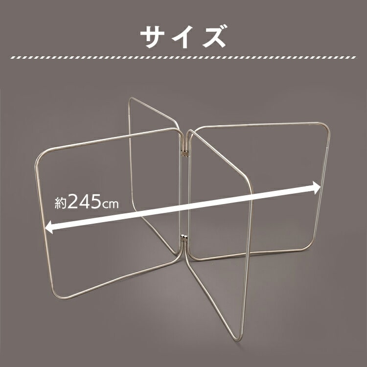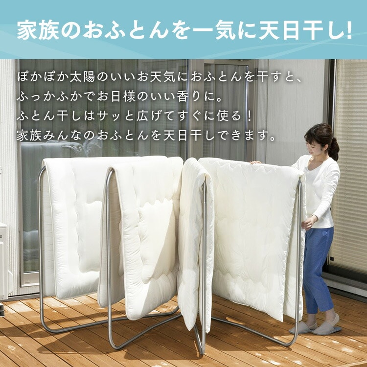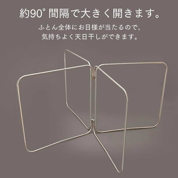 ※ご使用にならない場合は、雨のあたらない場所へ保管してください。雨天時に屋外に放置するとパイプ接合部の隙間より雨水が侵入し、サビや劣化の原因となります。布団へのサビや汚れがつく原因となりますので必ずお守りください。 ※ステンレスは耐腐食性に優れていますが、サビないのではなくサビにくい素材です。少しの鉄粉、塩分で、もらいサビを起こすことがあります。 4枚掛けふとん干しです。 広げて干せる、布団を掛けやすい扇型タイプです。 使用しない時はコンパクトに折りたたんで収納することが可能。 ■商品サイズ(約):幅φ245×高さ125cm ■収納時サイズ(約):幅123×奥行き12×高さ125cm ■耐荷重(約):全体40kg、1本当たり10kg、 ■干す量(目安):布団4枚 ■主要材質 パイプ部分:ステンレス、 樹脂部分:ナイロン