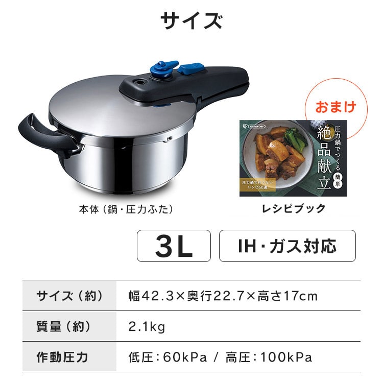 ●商品サイズ(cm)幅約42.3×奥行約22.7×高さ約17●製品質量2.1㎏●満水容量3L●材質本体:ステンレス鋼(クロム18%、ニッケル8%)はり底:ステンレス鋼(クロム16%)、底の厚さ4.5mm(はり底を含む)●圧力切替2段階圧力切り替え式●対応熱源IH・ガス対応