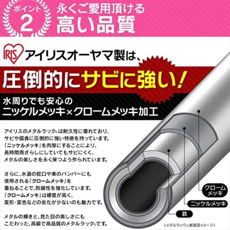 ●商品サイズ(cm)幅約25×奥行約48×高さ約88(キャスター込)●棚板サイズ(cm)幅約23×奥行約45×高さ約2.8●棚板内寸(cm):幅約20.6×奥行約43.6●重量約3.8kg●耐荷重全体:約40kg、棚板1枚当たり:約16kg●主要材質棚板・ポール:スチール(クロムメッキ)キャスター・アジャスター:ナイロン樹脂固定部品:スチロール樹脂●メーカー名アイリスオーヤマ(IRIS OHYAMA)