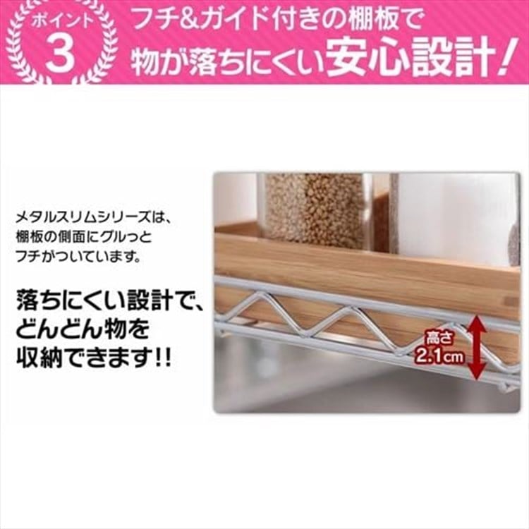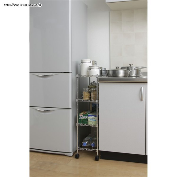 冷蔵庫とシンクの間、コンロと壁の間などにできる隙間を上手に活用することのできるメタルスリムです。