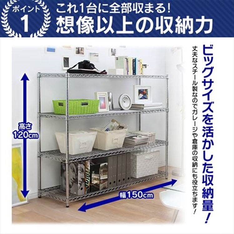 ●商品サイズ(cm)幅約150×奥行約46×高さ約120●棚板内寸(cm):幅約142.8×奥行約38.8●耐荷重棚板1枚あたり:約100kg、全体:約500kg●主要材質棚板・ポール:スチール(クロームメッキ)固定部品:ABS樹脂●メーカー名アイリスオーヤマ(IRIS OHYAMA)