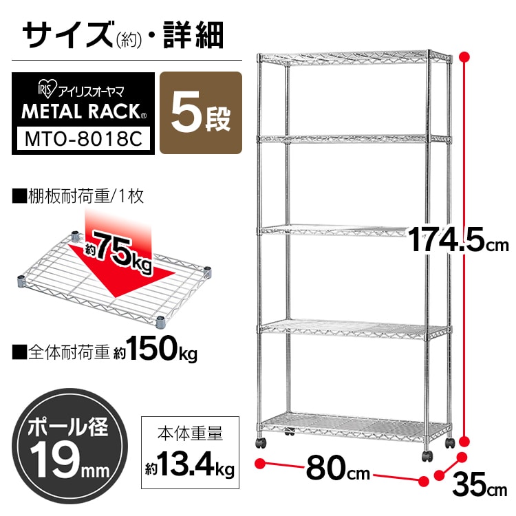 ●商品サイズ(cm)幅約80×奥行約35×高さ約174.5●キャスター・アジャスターをつけていない時の高さ(cm)約169●メタルミニのアジャスターを付けた時の高さ(cm)約171●耐荷重棚板一枚あたり:約75kg、全体:約150kg●主要材質本体:スチール(クロームメッキ)キャスター:ナイロン樹脂棚板固定部品:ABS樹脂●メーカー名アイリスオーヤマ(IRIS OHYAMA)