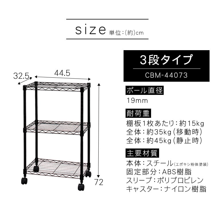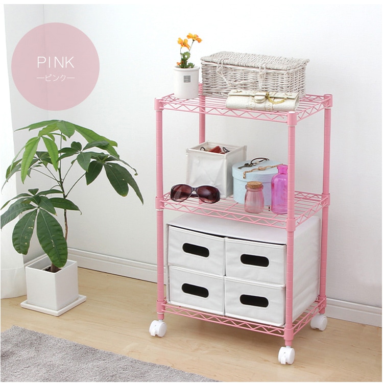CBボックスインナーがぴったり収まる、手頃なサイズのカラーメタルラックです!棚板3枚タイプのカラーメタルで、部屋の雰囲気に合わせて13色から選べます。移動の際に便利なキャスターが付いています。※お客様組み立て