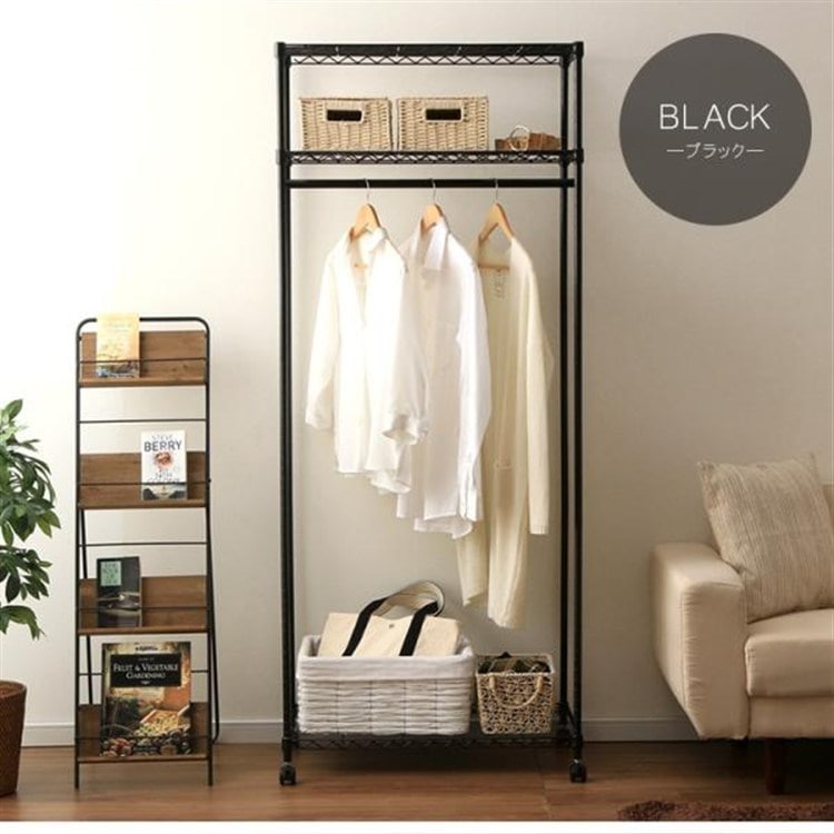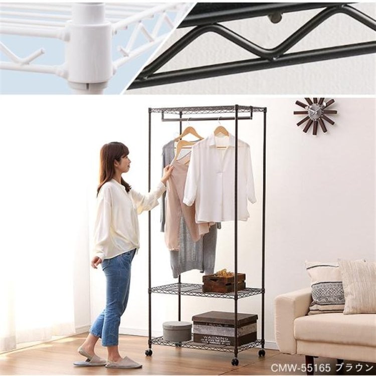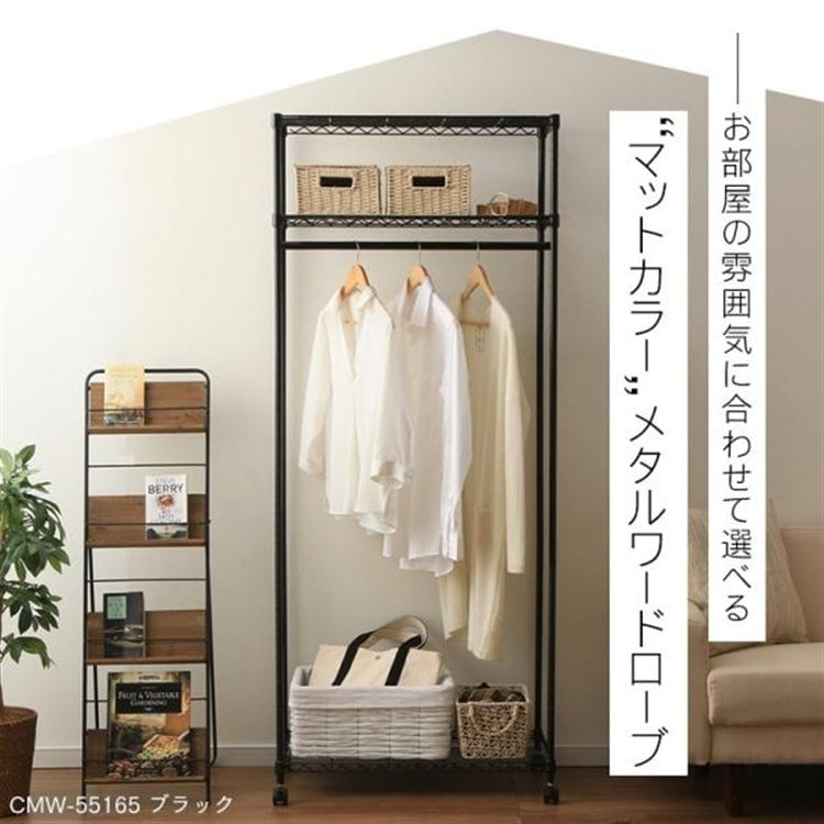 お部屋の雰囲気に合わせて選べるマットカラーのメタルラック。ネジ・釘を使わないので女性でも楽々組立てできます。【ポイント】◆棚板の高さは調節可能!長いコートも楽々収納ポールに入った2.5cm間隔の溝で棚板の高さが変えられるので、収納する物に合わせて、ムダなく最適なスペースで収納できます。◆キズ・サビに強い粉体塗装(パウダーコーティング)防錆性、耐熱性、耐油性があるので、水回りやキッチンにもおすすめ!◆余裕の耐荷重棚板1枚あたり耐荷重約50kg、ハンガー約20kg、全体約100kg!◆移動に便利なキャスター付きキャスターにはストッパーが付いています。