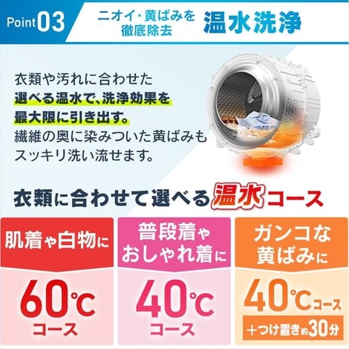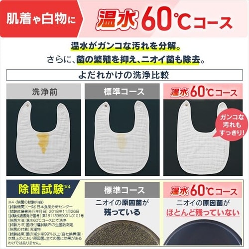・肌着や白物に「60℃コース」/高温水で洗浄し、ニオイの原因徹底除菌!