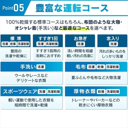 100%乾燥する標準コースはもちろん、布団のような大物・おしゃれ着(手洗い)など、最適なコースを選べます。