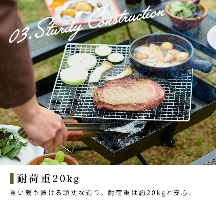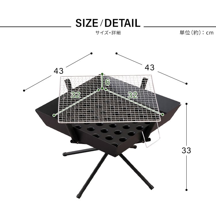 ●製品寸法(cm)<使用時>幅約43×奥行約43×高さ約33<収納時>幅約38×奥行約38×高さ約7<焼き網>幅約35×奥行約35<内寸>幅約32×奥行約32×高さ約6●製品重量約2.7kg●耐荷重約20kg●主要材質焼き網:ステンレススタンド:ステンレス(シリコン樹脂塗装)炉、ロストル:ステンレス(シリコン樹脂塗装)収納袋:ポリエステル