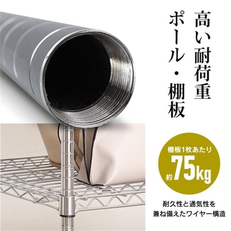 ●商品サイズ(cm)幅約150×奥行約46×高さ約210(アジャスター含む)●耐荷重棚板(1枚あたり):75kg全体:450kg※耐荷重は測定値であり、保証値ではありません。●主要材質棚板・ポール・転倒防止金具:スチール(クロムメッキ)棚板固定部品:ABS樹脂アジャスター:スチール、ナイロン樹脂●必要工具ソフトハンマー(プラスチック、木ゴム製等)