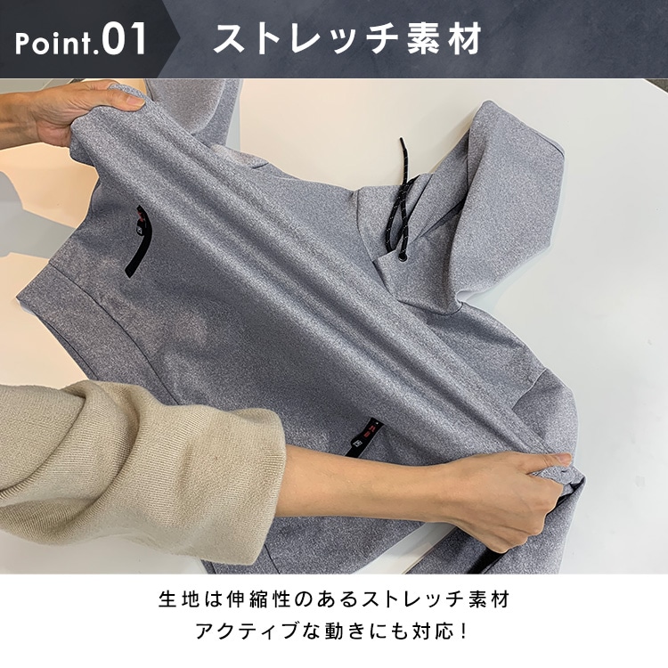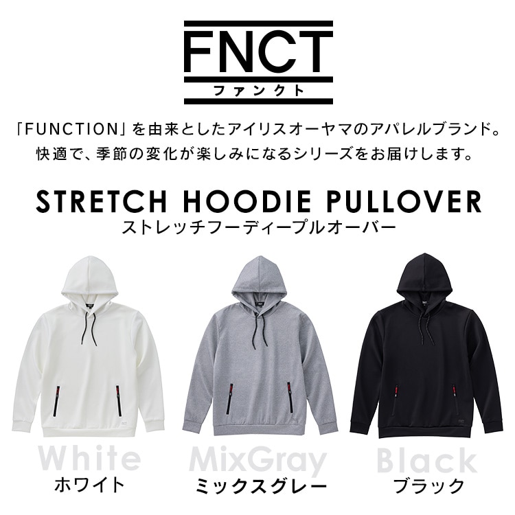 軽くて良く伸びるから動きやすい、ストレッチフーディープルオーバー。【FNCT(ファンクト)】「FUNCTION」を由来とした、アイリスオーヤマのアパレルブランド。快適で、季節の変化が楽しみになるシリーズをお届けします。S~3Lまでの豊富なサイズ展開。男女兼用で着用できます。point.1:ストレッチ素材生地は伸縮性のあるストレッチ素材。アクティブな動きにも対応!point.2:ファスナー付きポケット運動時やかがんだ際など、収納物の落下を防ぐ。さらっとした肌触りの良い素材を使用。屋内外問わず、快適な着用感。反射機能がついたロゴ入り。デザインのアクセントにも!