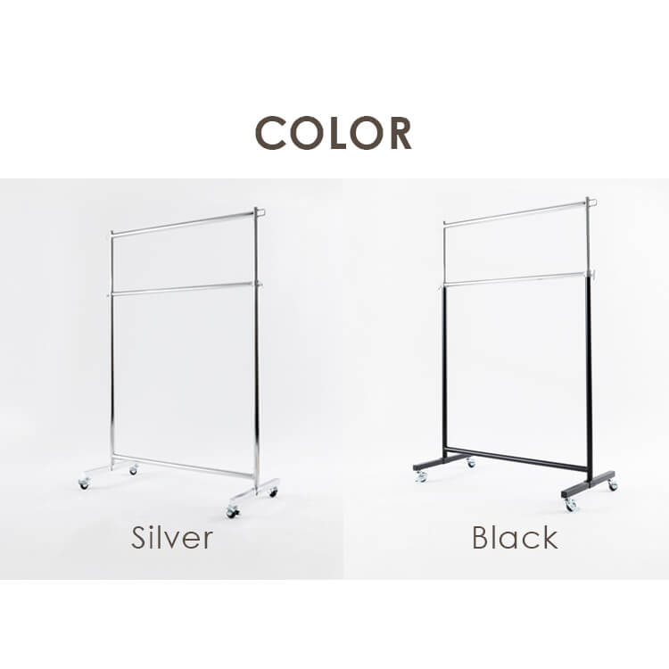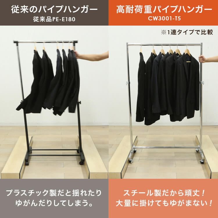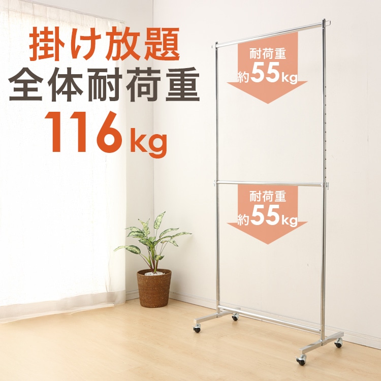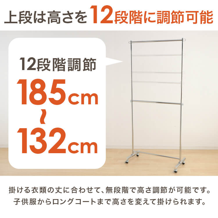 服をかけても、移動しても、グラつかない耐荷重80kgタイプのパイプハンガーです。上下2段で大量の服を省スペースに整理整頓できます。高さは5cm間隔で12段階に調節可能。