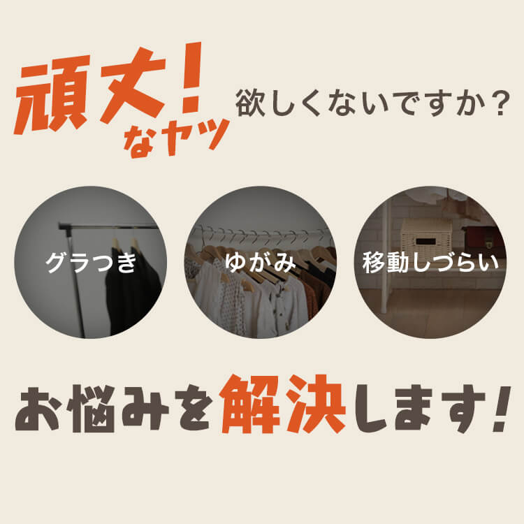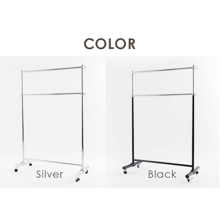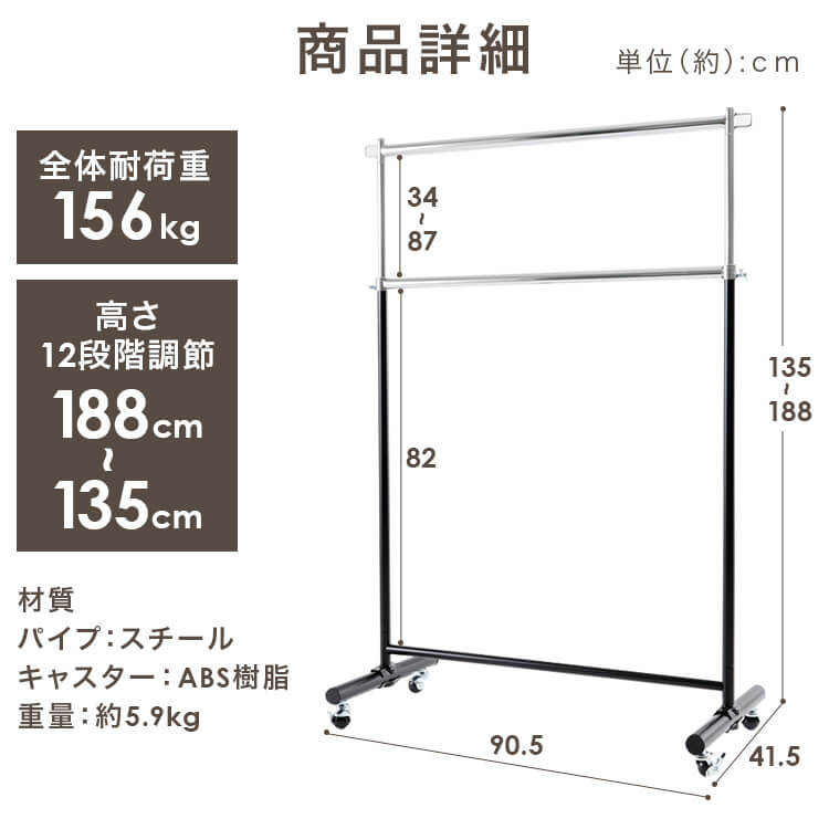 服をかけても、移動しても、グラつかない耐荷重156kgタイプのパイプハンガーです!上下2段で大量の服を省スペースに整理整頓できますです。高さは5cm間隔で12段階に調節可能。