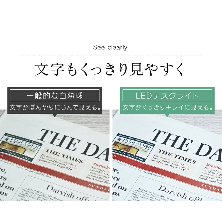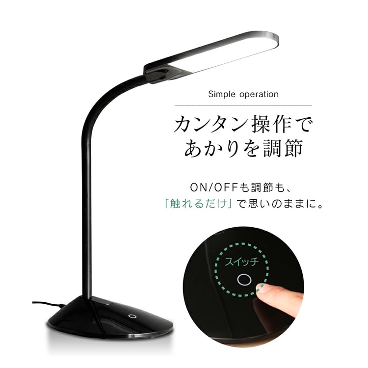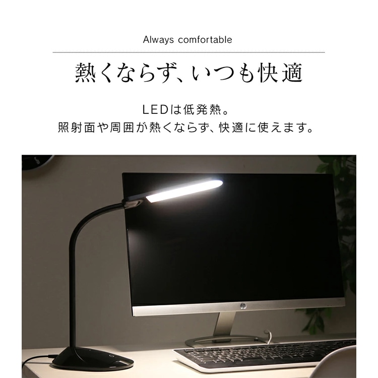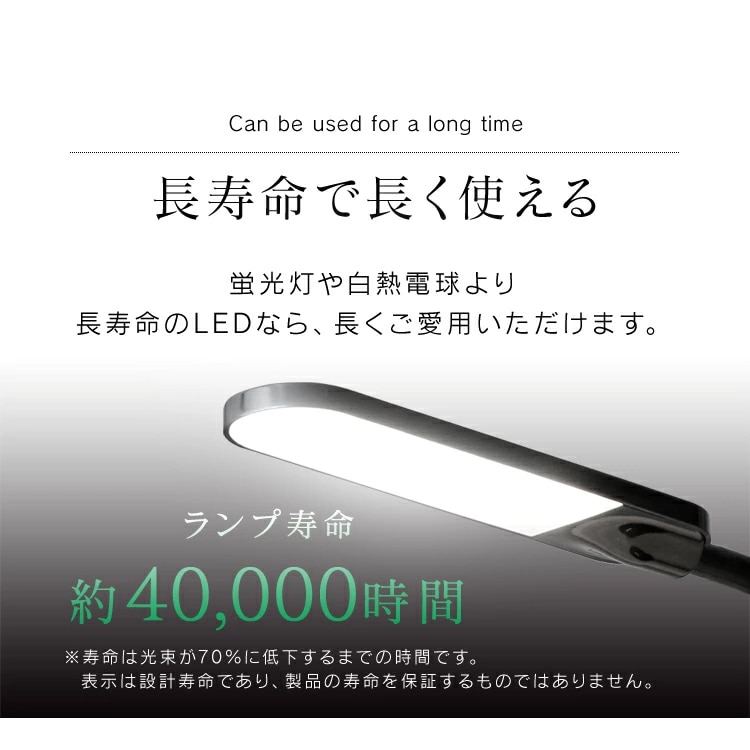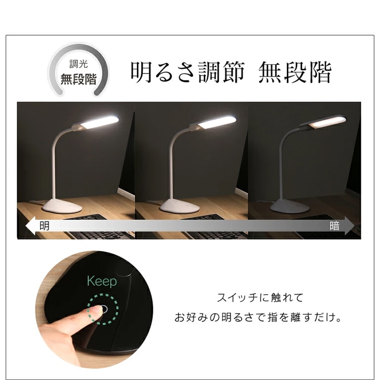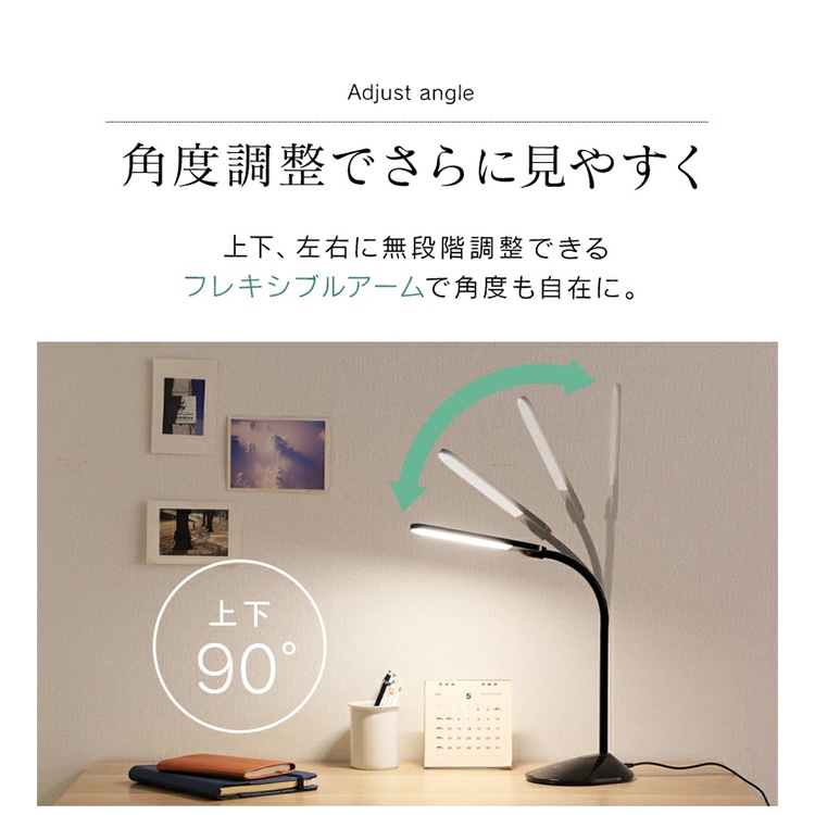 調光・調色機能付きLEDデスクライトです。オフィスやご自宅など、様々なシーンで活躍します。上下90度、左右各30度に角度調整できるフレキシブルアームでさらに見やすく!明るさのメモリー機能付き。