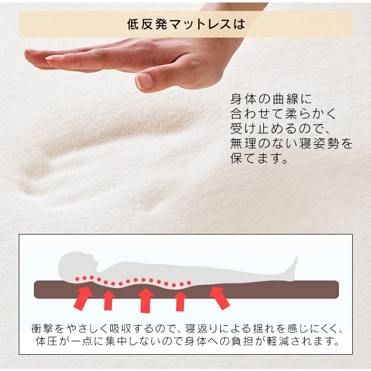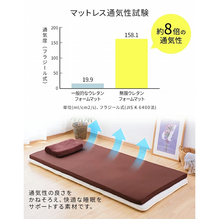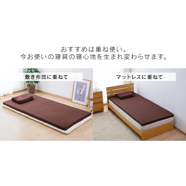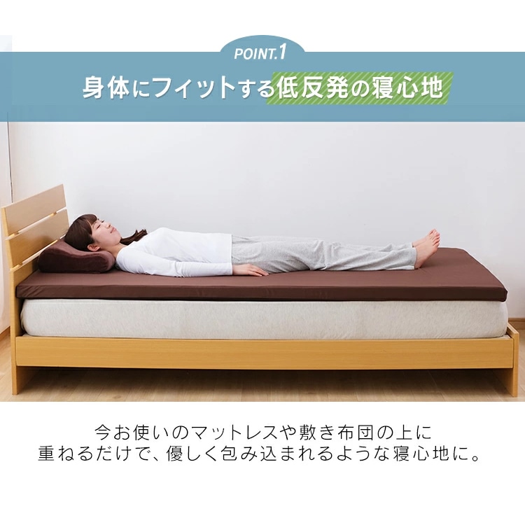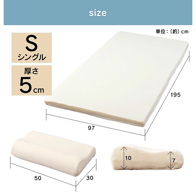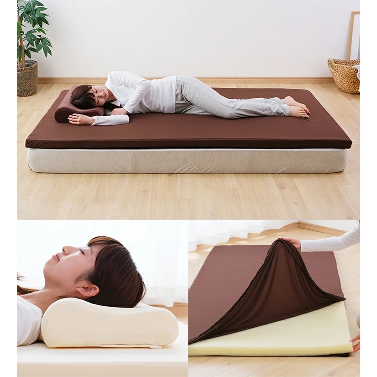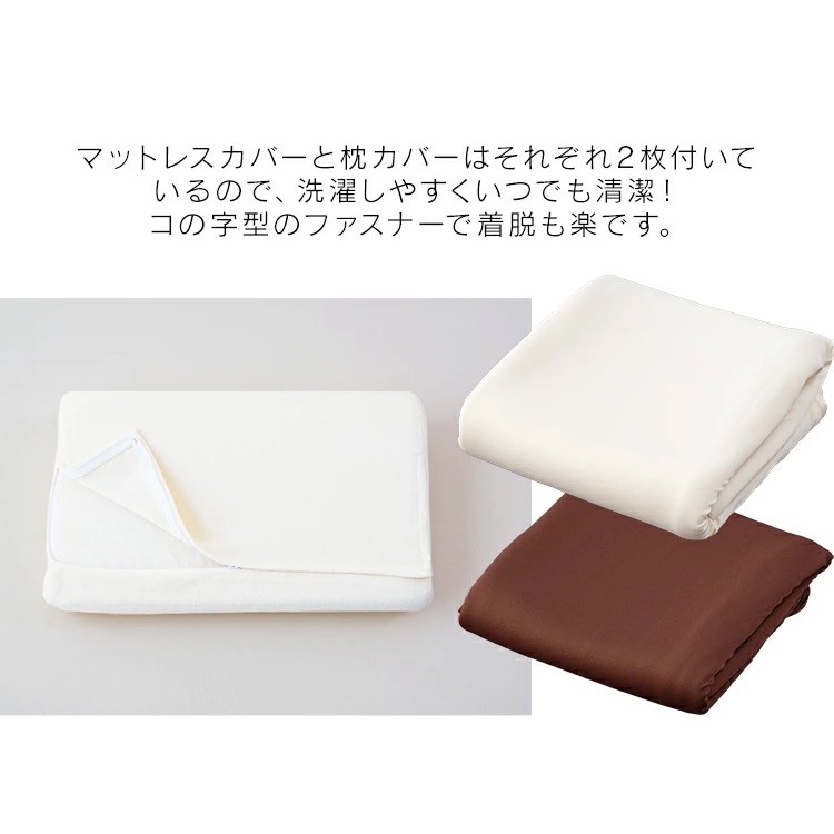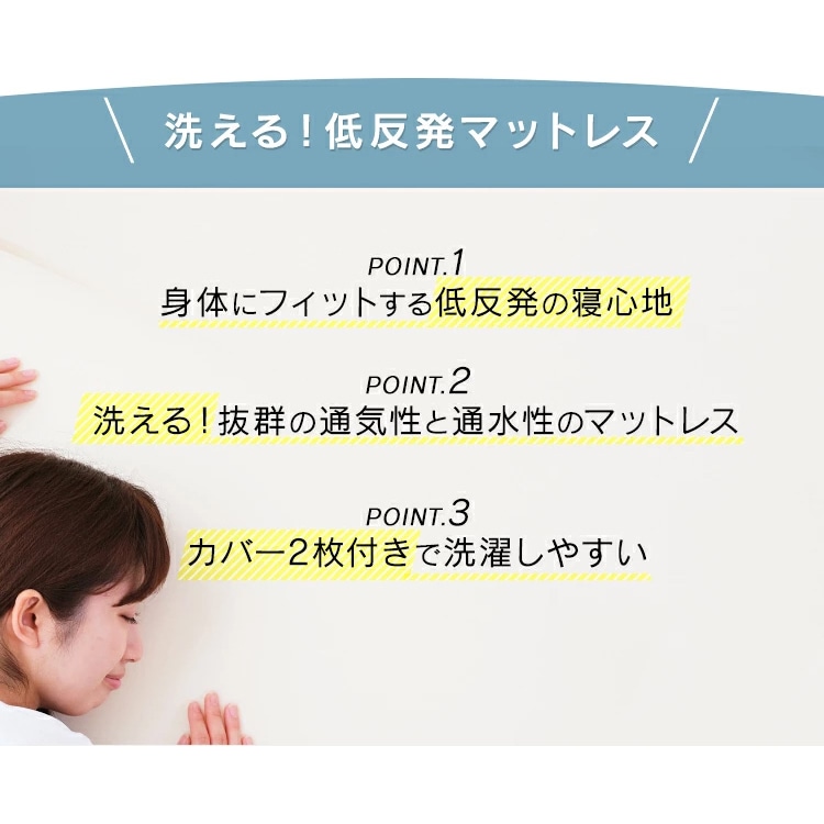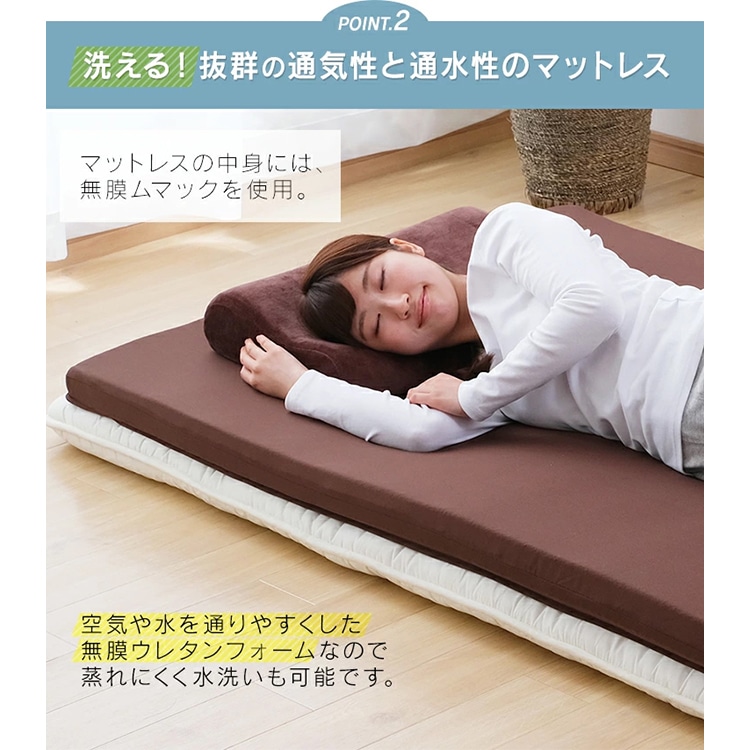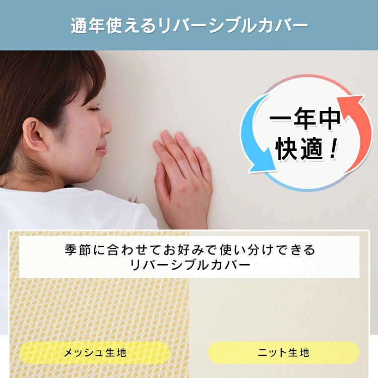 洗える「低反発マットレス&枕」セット。 今お使いのマットレスや敷き布団の上に重ねるだけで、優しく包み込まれるような寝心地に。 低反発マットレスは身体の曲線に合わせて柔らかく受け止めるので、無理のない寝姿勢を保てます。 マットレスの中身には、ムマック(R)を使用。 ムマック(R)は空気や水を通りやすくした無膜ウレタンフォームなので蒸れにくく水洗いも可能です。 ※ムマック(R)はアキレスの登録商標です。 枕は、頭部から首筋にフィットする形状で、お好みの高さを選んでお使い頂けます。(低め約7cm、高め約10cm) 高密度ウレタンは、抜群の耐久性で快適な寝心地が長く続きます。 マットレスカバーと枕カバーはそれぞれ2枚付いているので、洗濯しやすくいつでも清潔。 コの字型のファスナーで着脱も簡単です。 季節に合わせてお好みで使い分けできるリバーシブルカバーは、メッシュ生地とニット生地で一年中快適にお使いいただけます。 ●商品サイズ(cm) マットレス:幅約97×奥行約195×高さ約5 枕:幅約50×奥行約30×高さ約7cm/約10cm ●商品重量 約5.02kg ●材質 表生地・マチ部:120g/m2ポリニット生地(ポリエステル100%)、裏地:150g/m2ハニカムメッシュ生地(ポリエステル100%)、中材:ウレタンフォーム