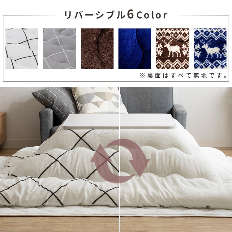 今年の冬はこたつスタイル、柔らかく軽いふっくらわた入りのこたつ掛布団です。ふんわりとなめらかで保温力も抜群のマイクロサンゴマイヤー生地を両面に使用、リバーシブルであたたかさをキープします。ぬくもり感じる濃色カラーと北欧風のノルディック柄でお部屋をあたたかな雰囲気に。※こちらのページはこたつ掛布団のみの販売です。