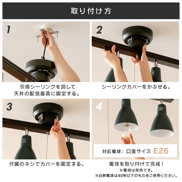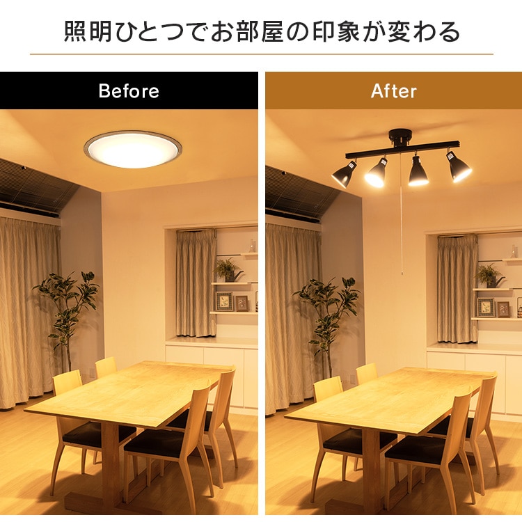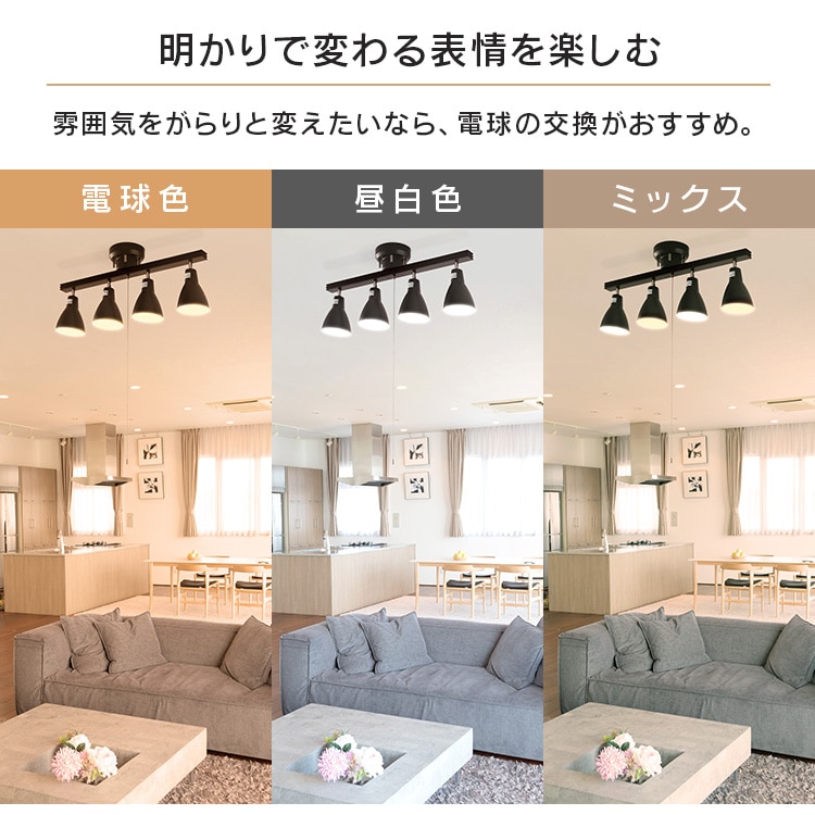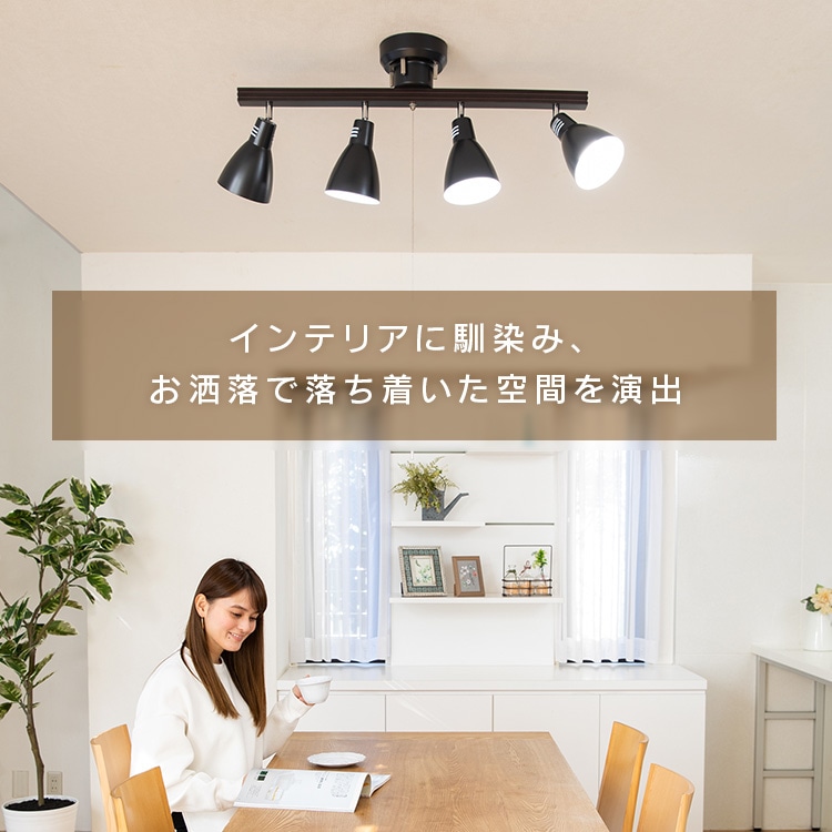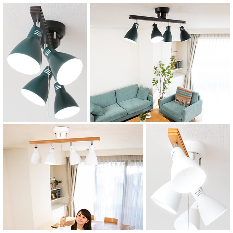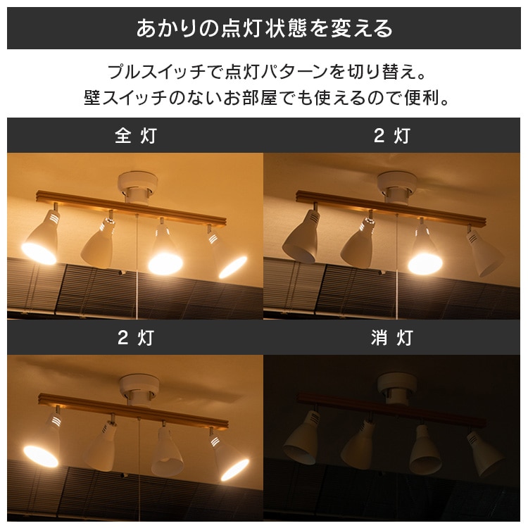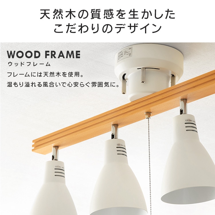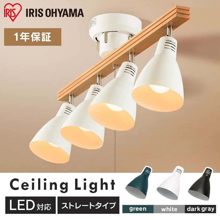 [4灯シーリングライト ストレートタイプ]レトロでおしゃれなシーリングライトです。シェードひとつひとつの角度を自由に調整できます。◆素材の質感を生かしたこだわりのデザインフレームには天然木を使用。温もり溢れる風合いで心安らぐ雰囲気に。スチールにマット加工を施したシェードで、やわらかなイメージに。レトロな雰囲気が魅力です。[LED電球]トップランナー制度対応、2017年度省エネ法目標基準値達成のLED電球です。明るさはそのままで、よりコンパクトになりました。白熱電球のように広範囲に明るい広配光タイプで、リビング・ダイニング・キッチン・玄関・階段などの照明に最適。口金サイズがE26口金なので、照明器具を替えることなくご使用いただけます。光色はバランスが取れた明るさで過ごしやすい空間を演出する「昼白色相当」と温かみのある「電球色相当」。密閉形器具に使用可能。断熱材施工器具には使用できません。(※密閉形器具の種類によって、寸法が合わない、熱がこもる等の要因により、使用できなかったり、寿命が短くなる場合があります。)調光(明るさを調節できる)機能のついた器具には使用できません。安心の5年保証付き!長寿命約40000時間でランプ交換の手間も省けます。◆LED電球の特長水銀レス:環境に有害な水銀を含みません。すぐに明るく:スイッチを入れた瞬間に明るく点灯します。虫が集まりにくい:虫が集まりやすい紫外線領域波長をほとんど出さず、灯具清掃の手間を軽減できます。ON/OFFに強い:スイッチを頻繁にON/OFFしても劣化せず、寿命が短くなりません。低UV/低赤外線:紫外線や赤外線をほとんど出さないので、紫外線による色あせや赤外線による熱が気になりません。