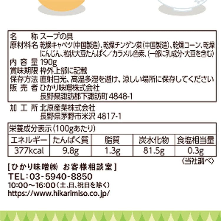 「畑の具」は、畑で採れる5種類の野菜がミックスされた乾燥具材のパックです。5種類の畑の具:チンゲン菜、キャベツ、にんじん、とうもろこし、大豆たんぱく使い方は簡単便利。即席スープやラーメン、おみそ汁の他、ご家庭での調理にプラスすることで、具材が彩り豊かにリッチになります。商品の袋には湿気や光を遮る効果の高いアルミ箔素材を使い、チャックもついているので保存がしやすく、デザインもかわいいのでキッチンの雰囲気を明るくします。また、賞味期限が製造から1年と長いので防災用の常備品としてもおすすめです。*乾燥させた素材のみで、味やだしは付いていません。原産国:日本