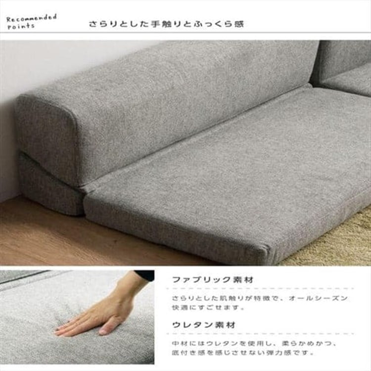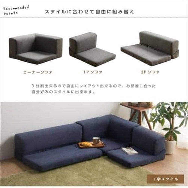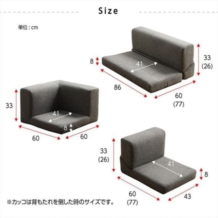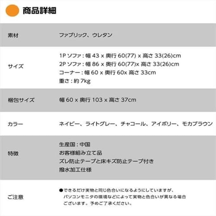●商品サイズ(cm)※( )は背もたれを倒した時のサイズです。組み合わせ時:幅約146×奥行約103×高さ約332人掛け:幅約86×奥行約60(77)×高さ約33(26)1人掛け:幅約43×奥行約60(77)×高さ約33(26)コーナー:幅約60×奥行約60×高さ約33●商品重量組み合わせ時:約7kg●材質側生地:ポリエステル100%(撥水加工)中材:ウレタンチップフォーム