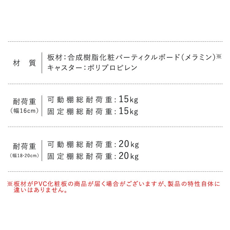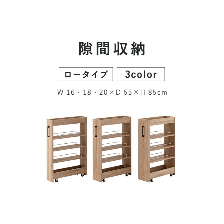 お部屋のちょっと余った隙間を収納スペースに変えられる、ロータイプのラックです。天板まで物が置けるので、収納をより有効活用できます。上下各1段の棚が可動式になっており、収納したい物の高さに合わせて1.6cm間隔で高さが調整可能。キャスター付きで、取り出す際も取っ手を持ってすぐに引き出せます。また、小物などが飛び出さない様に転び止め付きで安心。水や湿気に強い素材を使用しているので、キッチンや洗面所・トイレなどでも使用できます。★お客様組立★※板材がPVC化粧板の商品が届く場合がございますが、製品の特性自体に違いはありません。