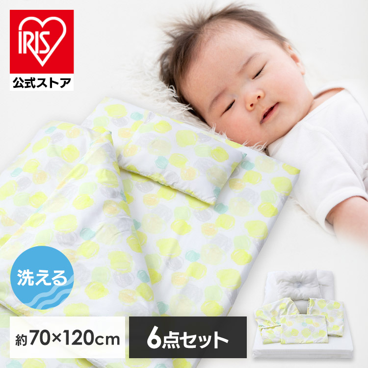カラフルでかわいい、洗えるベビー用布団セットです。届いて直ぐに使える便利な6点セット。