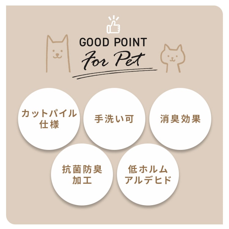 【商品説明】ペットの爪などが引っ掛かりにくい、カットパイル仕様のタイルカーペットです。フローリングでは慎重に歩くことで関節に負担がかかりやすいので、タイルカーペットでペットの体の負担を軽減。汚れたところだけサッと外して手洗いできるので、いつでも清潔、取り外して・敷いての着脱も簡単です。消臭・抗菌防臭・低ホルムアルデヒドの3つの試験をクリア、より快適・安全に過ごせます。裏面はすべりにくいPVC(ポリ塩化ビニル樹脂)なので、ずれにくく、めくれにくいので快適。どんなテイストにもなじむシンプルで使いやすいカラーです。【商品仕様】●商品サイズ(cm)幅約50×奥行約50×高さ約0.6●商品重量約950g●材質表地:ポリプロピレン70%、ポリエステル30%裏地:PVC(ポリ塩化ビニル)●お手入れ方法汚れた場合は外してお風呂場や大きめの洗面台で水洗いしてください。汚れが落ちにくいときは中性洗剤やスポンジを使用してください。洗濯機使用不可。●保証期間2年間