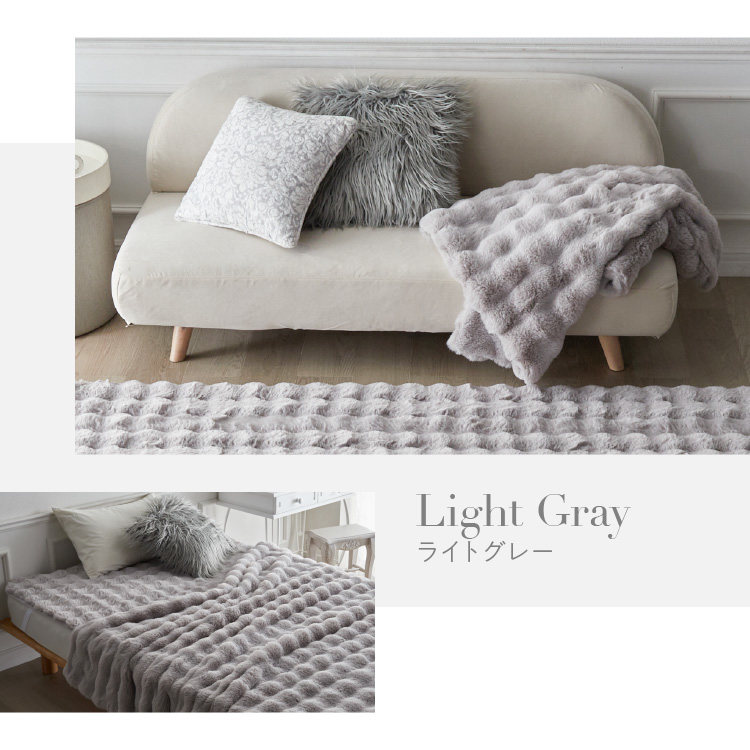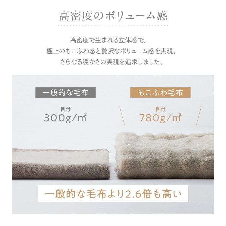 もこもこした立体カットでとろけるような肌ざわりが特長のラビットファー面と、短い毛足で上品な光沢感となめらさが特長のフランネル面の2つの素材を楽しめます。