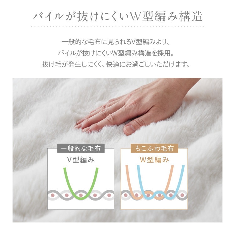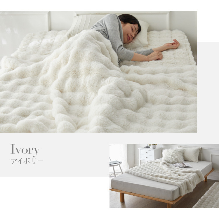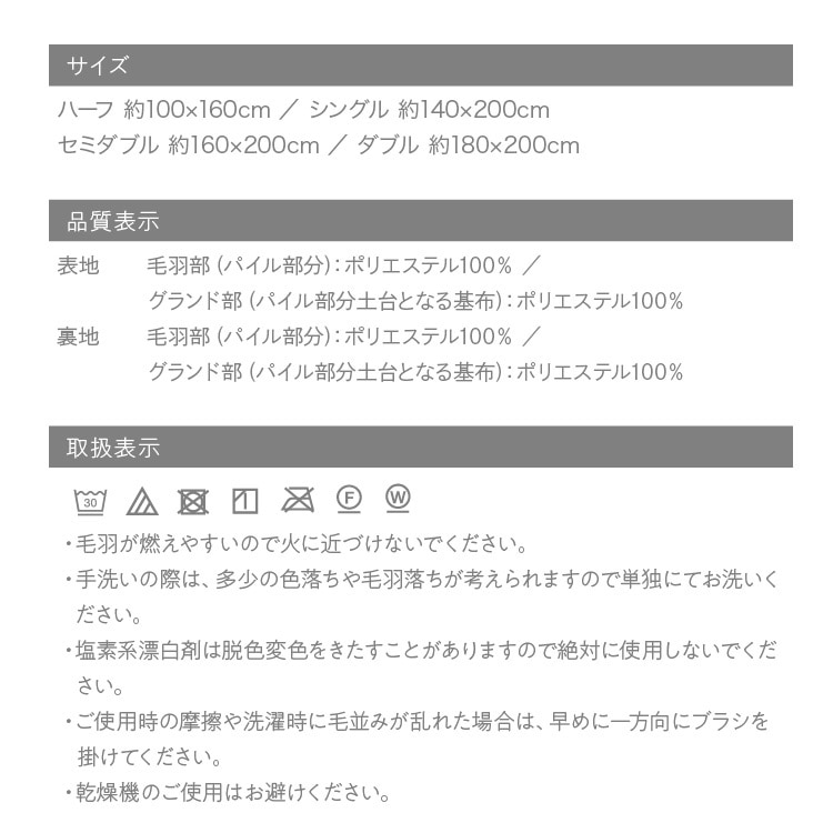 【商品仕様】●商品サイズ(cm)ハーフ:幅約100×奥行約160シングル:幅約140×奥行約200セミダブル:幅約160×奥行約200ダブル:幅約180×奥行約200●商品重量ハーフ:約1.24kgシングル:約2.18kgセミダブル:約2.49kgダブル:約2.8kg●材質表面:ポリエステル100%(ラビットファー面 480g/m2)裏面:ポリエステル100%(フランネル面 300g/m2)●お手入れ方法洗濯機で丸洗い可能、乾燥機のご使用はお避けください。