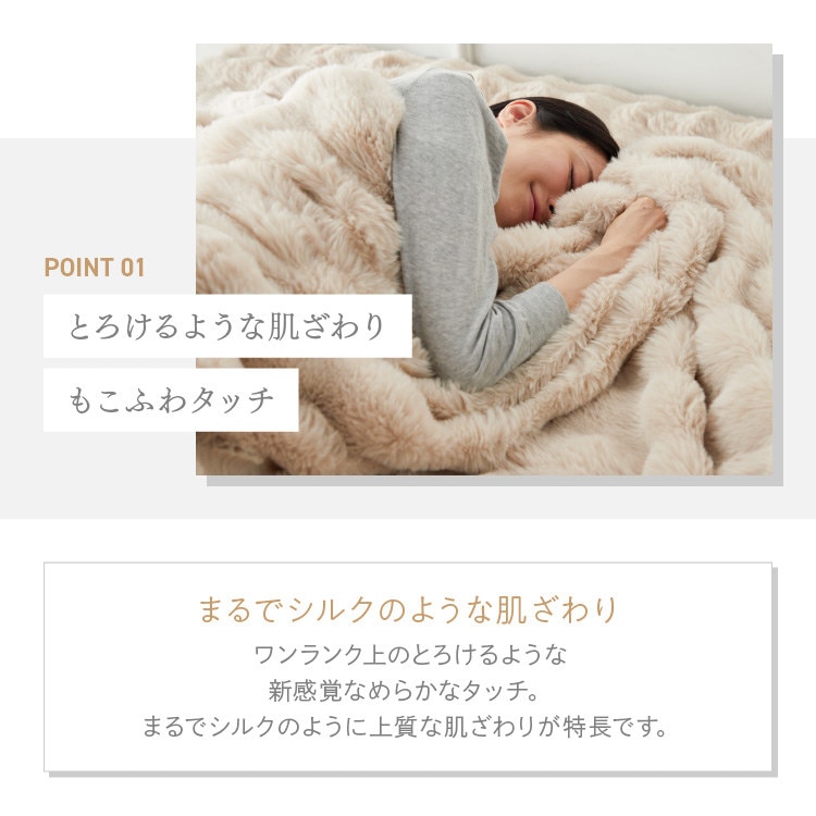 ロングパイルファー仕立てで、ずっと触れていたいタッチ感が癖になる2枚合わせの毛布です。