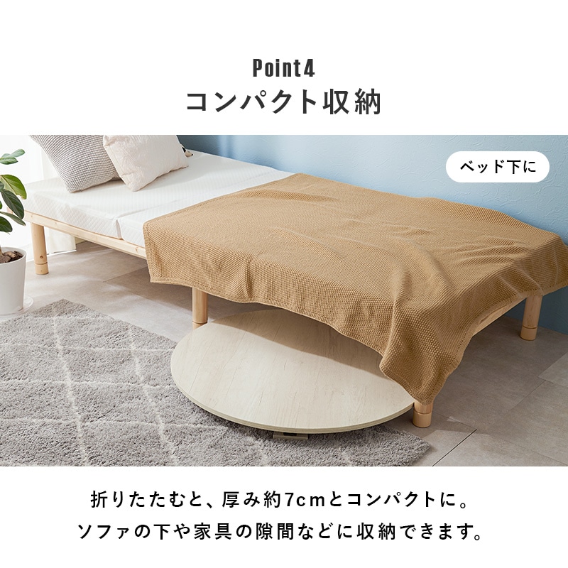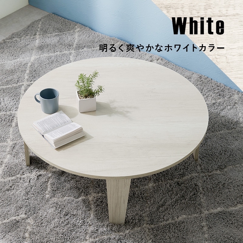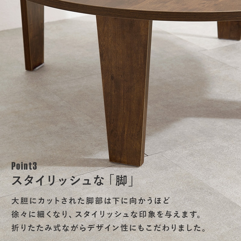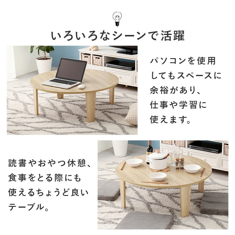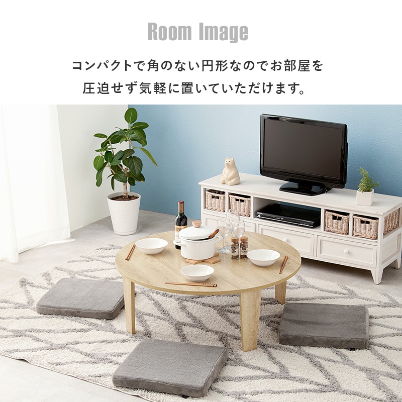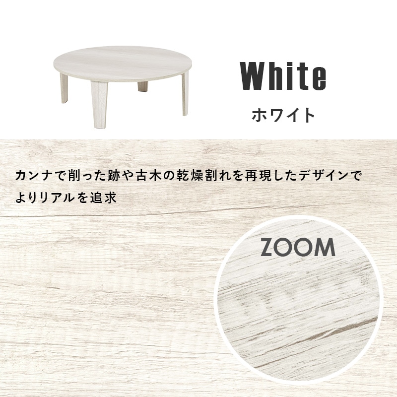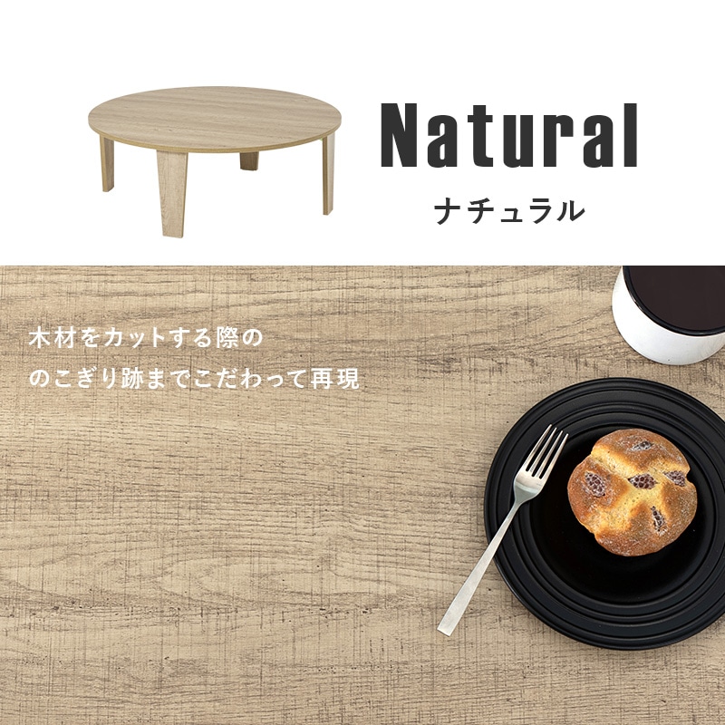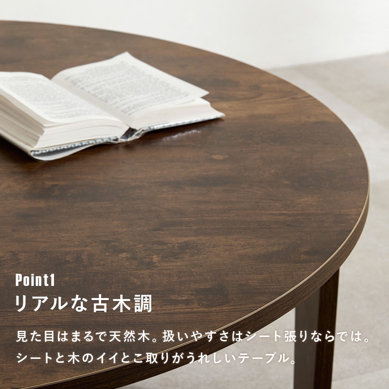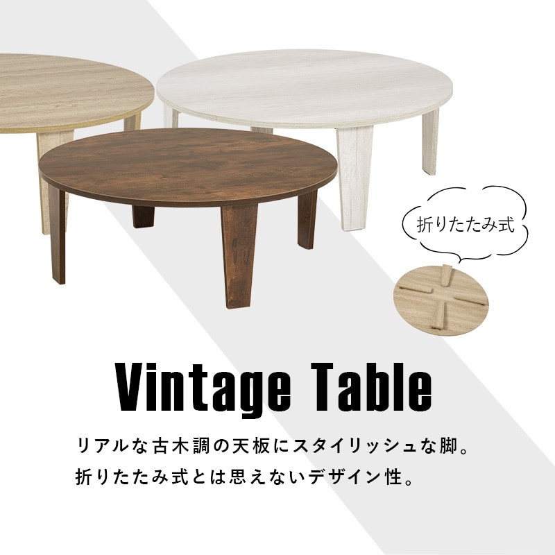 【商品説明】まるで天然木のような古木調の色合いと、木目感の再現にこだわった円形テーブル。折りたたみ機能付きなのでコンパクトに収納できます。★完成品★【商品仕様】●商品サイズ(cm)幅約88×奥行約88×高さ約32折り畳み時厚さ:7cm●商品重量約9kg●材質メラミン樹脂化粧繊維板