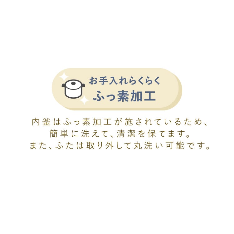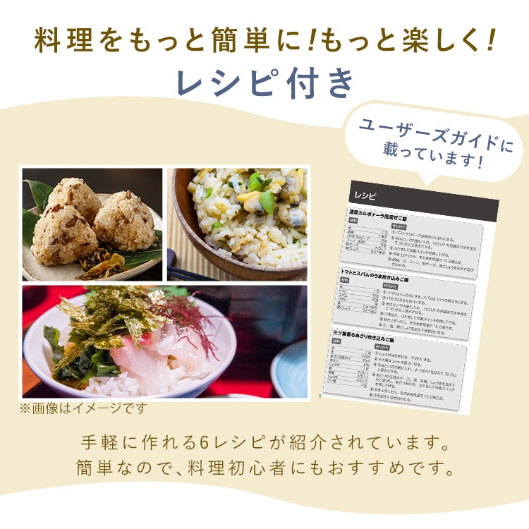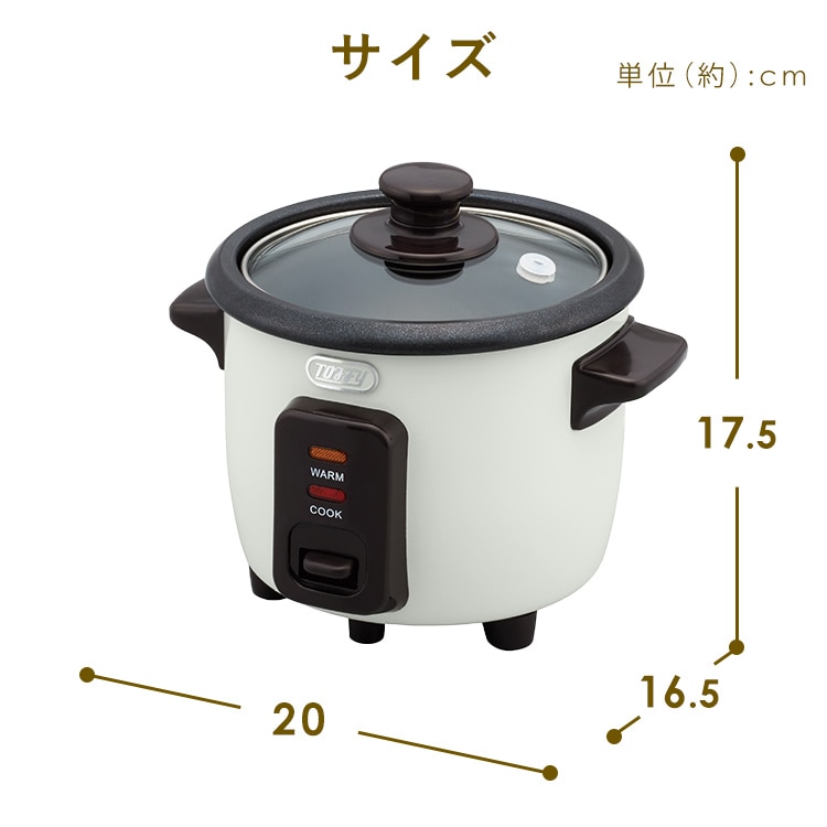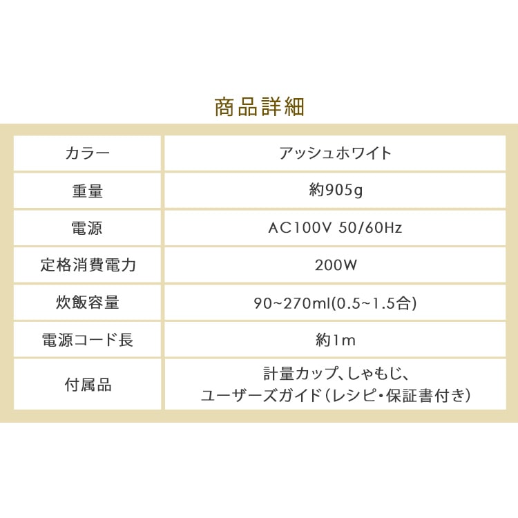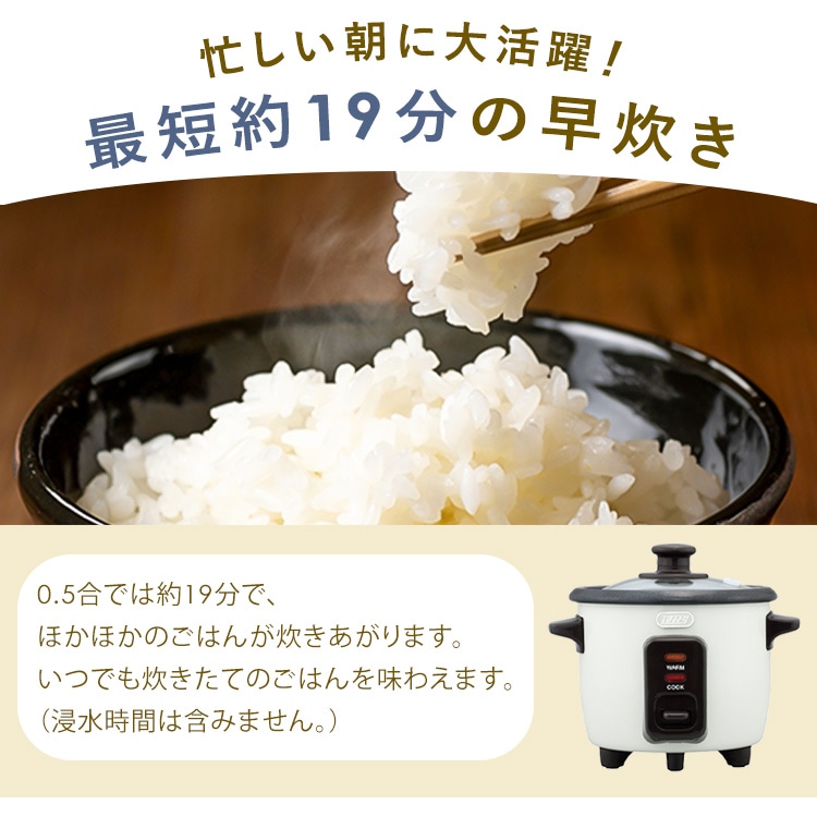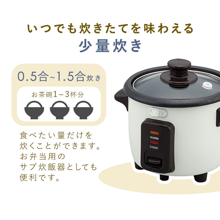 【商品説明】お米とお水を入れて、スイッチを入れるだけ!シンプルで多彩な料理ができる電気炊飯器です。少量炊き0.5~1.5合0.5合なら最短19分で炊き上がり。忙しい日も炊きたてのごはんが食べたいという方にもピッタリです!【商品仕様】●商品サイズ(cm)幅約20×奥行約17×高さ約18●商品重量約1kg●電源AC100V 50/60Hz●定格消費電力200W●炊飯容量90~270ml(0.5~1.5合)●電源コード長約1m●付属品計量カップ、しゃもじ、ユーザーズガイド(レシピ・保証書付)