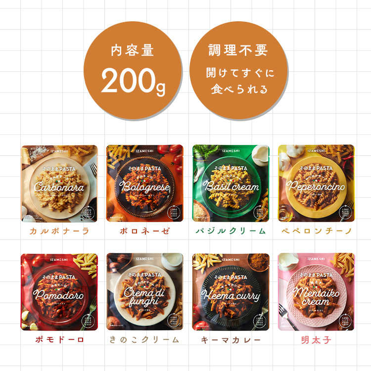 【商品説明】袋を開けてそのまま食べられる新感覚の長期保存パスタです。【ABOUT そのままPASTA】1.開けてすぐに食べられるショートパスタとソースが合わさって袋に入っているため、調理不要で、開けた瞬間にお召し上がりいただける新感覚の長期保存パスタです。2.独自製法で麺が伸びない開発に約4年かかった独自の製法で、時間が経っても伸びにくく弾力のある食感を実現しました。ソースと絡み合う、こだわりのパスタをご堪能ください。3.食べやすいショートパスタ1本1本が短いショートパスタは、食べやすく、シェアして食べることもできます。また、混ぜやすいのでオリジナルアレンジの幅も広がります。4.長期保存が可能賞味期限は製造から3年。突然の災害時はもちろん、日常のちょっとした「イザ」という時にも。【IZAMESHIとは?】食べずに捨てる備蓄食から、食べる長期保存食へ。いつでも、どこでも、おいしく食べられる。ご飯やおかずはもちろん、パンやスイーツまでフルコースの食事が揃う長期保存食IZAMESHI(イザメシ)。災害時の備えとしてだけでなく、普段の食事でもおいしく食べられることにこだわったメニューです。※保存年数は製造日より起算しています。【カルボナーラ】チーズのコクが広がる濃厚な卵の旨みをお楽しみください。【ボロネーゼ】野菜の旨みとしっかりとしたお肉の食感をお楽しみください。【バジルクリーム】爽やかなバジルの香りをクリーミーでコクのある味わいに仕上げました。【ペペロンチーノ】ガツンとにんにくが効いたピリッと辛い大人な味に仕上げました。【ポモドーロ】濃厚なトマトソースをシンプルにバジルとオレガノで仕上げました。【きのこクリーム】きのこの旨みが詰まった濃厚なクリームソースをお楽しみください。【キーマカレー】味わい深いスパイシーなキーマカレーをショートパスタでお楽しみください。【明太子】ピリッと辛口の明太子をショートパスタとよく絡むクリーム仕立てにしました。※リニューアルに伴い、パッケージ・内容等予告なく変更する場合がございます。予めご了承ください。【商品仕様】【共通】●内容量200g●商品区分一般食品●賞味期限製造から1095日●保存方法別途パッケージに記載●原産国日本●お召し上がり方常温でお召し上がりいただけますが、温めるとよりおいしくお召し上がりいただけます。・お湯で温める場合:袋のままお湯に入れて温めてください。(袋のままで約5分)・電子レンジで温める場合:中身を深めの容器に移し、ラップをかけて温めてください。加熱時間は、機種・ワット数により異なります。●ご注意本品はレトルトパウチ食品です。袋が破損すると腐敗の原因となります。開封後はお早めにお召上がりください。ごみの分別は市区町村の定める区分に従ってください。【カルボナーラ】●原材料マカロニ(国内製造)、植物油脂、乳等を主要原料とする食品(植物油脂、チーズ、脱脂粉乳、乳たん白、バターオイル、バター、加糖練乳、食塩、卵黄油、でん粉、無糖練乳)、たらこ加工品(たらこ、植物油脂)、還元でん粉分解物、醸造酢、魚介エキス、香辛料、酵母エキスパウダー、ガーリックパウダー、でん粉、酵母エキス、食塩、卵黄油/トレハロース、増粘剤(キサンタンガム)、調味料(アミノ酸等)、着色料(コチニール、カロチノイド)、(一部に卵・乳成分・小麦・大豆を含む)●成分 1食(200g)当たりエネルギー:501kcal、たんぱく質:9.4g、脂質:32.6g、炭水化物:42.4g、食塩相当量:2.1g※この表示値は推定値です。●アレルギー物質卵、乳、小麦、大豆【ボロネーゼ】●原材料マカロニ(国内製造)、野菜(たまねぎ、トマト)、食肉(牛肉、豚肉)、粒状植物性たん白、植物油脂、トマトペースト、還元でん粉分解物、トマトピューレー、ラード、フォン・ド・ヴォー、醸造酢、小麦粉、チキンエキスパウダー、砂糖、食塩、酵母エキスパウダー、植物性たん白加水分解物、香辛料、ワイン、でん粉、ローストオニオンパウダー、酵母エキス、ガーリックパウダー/トレハロース、増粘剤(キサンタンガム)、カロチノイド色素、(一部に小麦・牛肉・大豆・鶏肉・豚肉を含む)●成分 1食(200g)当たりエネルギー:540kcal、たんぱく質:13.2g、脂質:22.8g、炭水化物:70.6g、食塩相当量:2.0g※この表示値は推定値です。●アレルギー物質小麦、牛肉、大豆、鶏肉、豚肉【バジルクリーム】●原材料マカロニ(国内製造)、乳等を主要原料とする食品(植物油脂、脱脂粉乳、チーズ、バター、加糖練乳、乳たん白、卵黄油、バターオイル、でん粉、無糖練乳、食塩)、還元でん粉分解物、バジルペースト(バジル、植物油脂、食塩)、植物油脂、チーズ、脱脂濃縮乳、ガーリックペースト、ワイン、でん粉、酵母エキスパウダー、卵黄油、魚醤、チキンエキスパウダー、酵母エキス、食塩、香辛料/トレハロース、増粘剤(キサンタンガム)、(一部に卵・乳成分・小麦・大豆・鶏肉を含む)●成分 1食(200g)当たりエネルギー:471kcal、たんぱく質:10.8g、脂質: