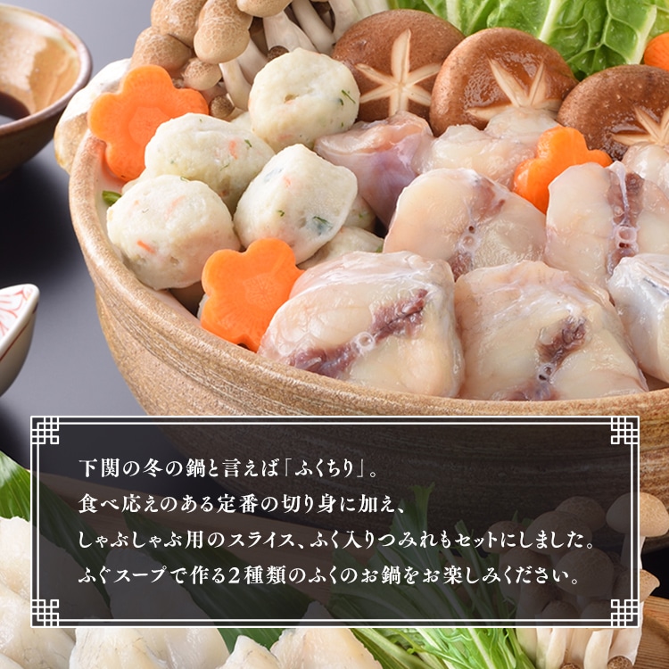 下関の冬の鍋と言えば「ふくちり」。食べ応えのある定番の切り身に加え、しゃぶしゃぶ用のスライス、ふく入りつみれもセットにしました。