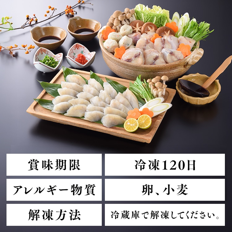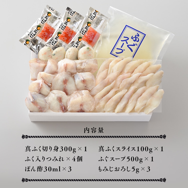 真ふく切り身300g×1、真ふくスライス100g×1、ふく入りつみれ×4個、ふぐスープ500g×1、ぽん酢30ml×3、もみじおろし5g×3