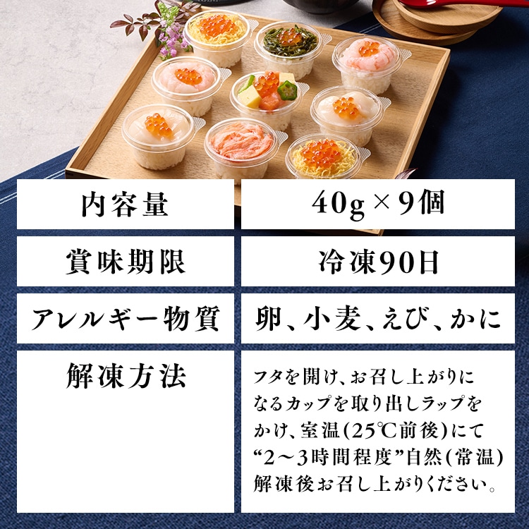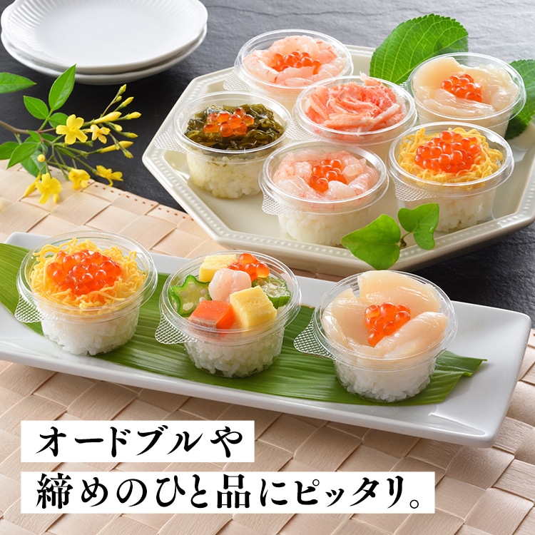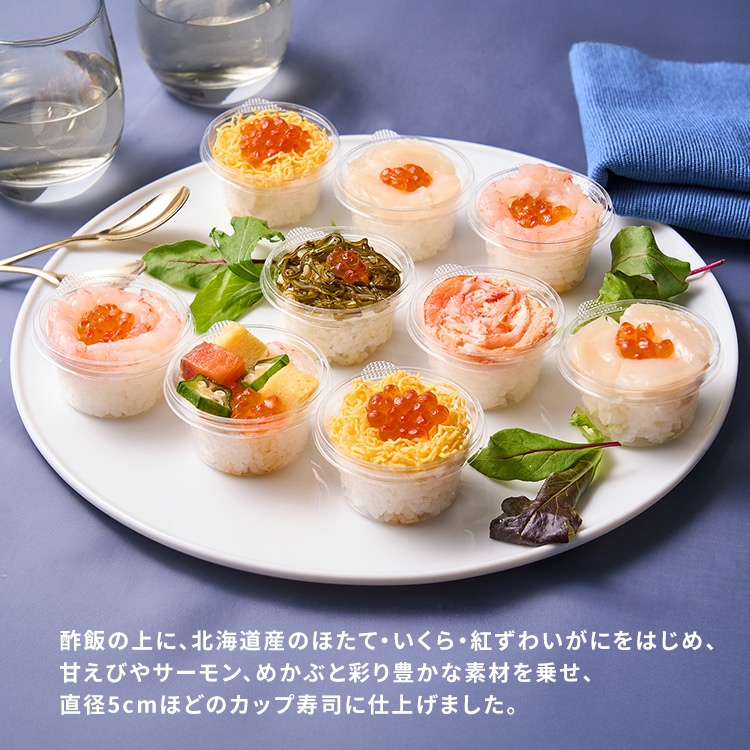 酢飯の上に、北海道産のほたて・いくら・紅ズワイガニをはじめ、甘えびやサーモン、めかぶと彩り豊かな素材を乗せ、直径5cmほどのカップ寿司に仕上げました。