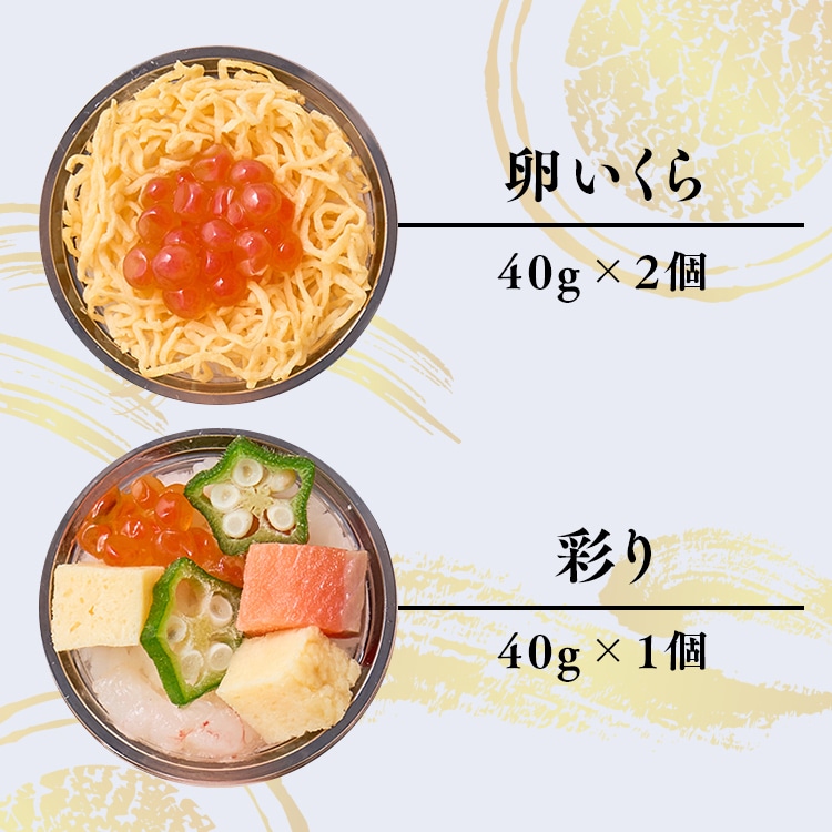 帆立いくら・甘えびいくら・卵いくら 各40g×2個、彩り・かに・めかぶいくら 各40g×1個(計9個)