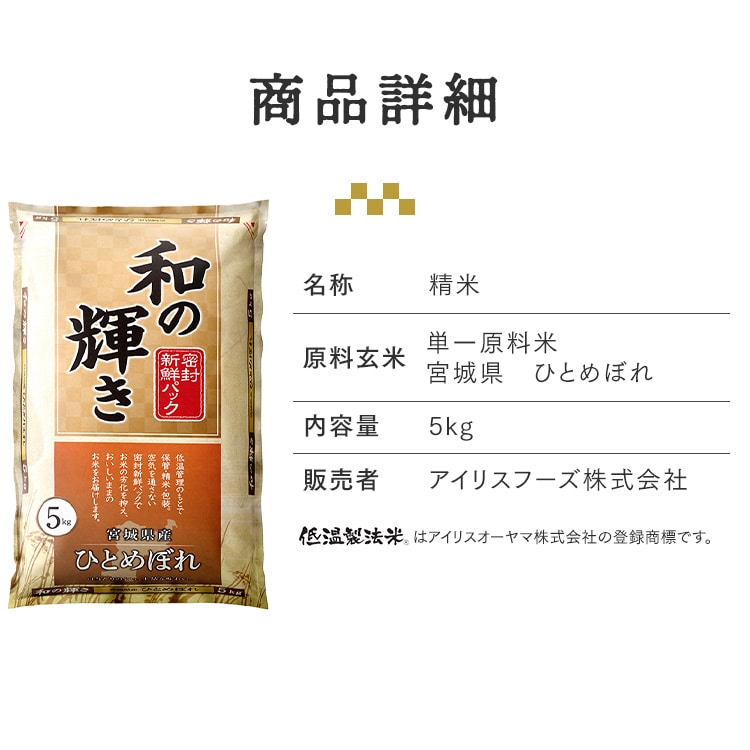 【商品説明】15℃以下の低温管理のもとで保管・精米・包装。空気を通さない密封新鮮パックでお米の劣化を抑え、おいしいままのお米をお届けします。粘り、甘み、ツヤ、うま味、香りのトータルバランスに優れていて「オールマイティーなお米」。炊き上がりはふっくら、食感はもっちりとしています。バランスがとれたやさしい味わいなので、いろいろな料理に合います。シンプルな味付けの料理にも合い、和食の定番メニューや炊き込みご飯との相性も抜群です。【商品仕様】●名称:精米●内容量:5kg●ブランド名:和の輝き●品種:ひとめぼれ●原料玄米:単一原料米●産地:宮城県【令和7年度産】●精米年月日:別途商品に記載