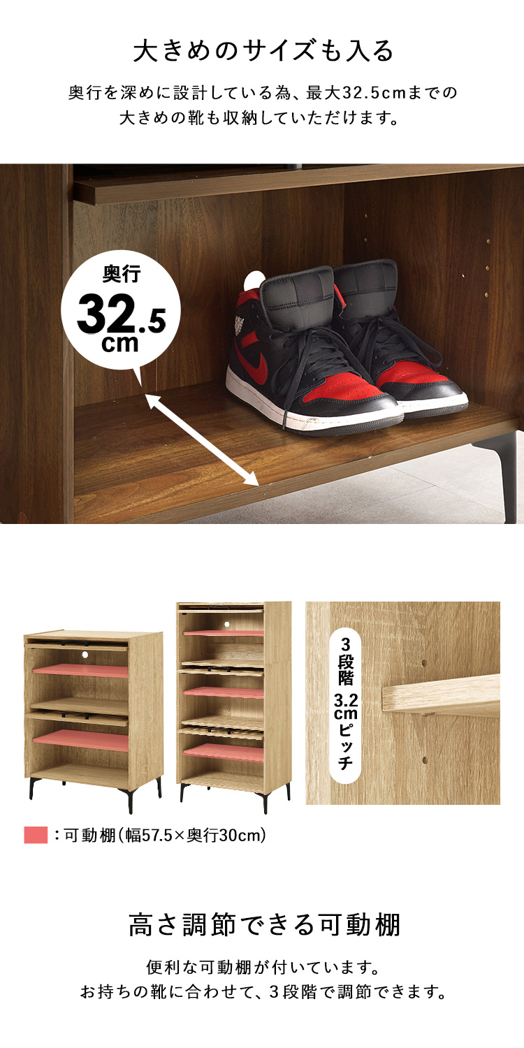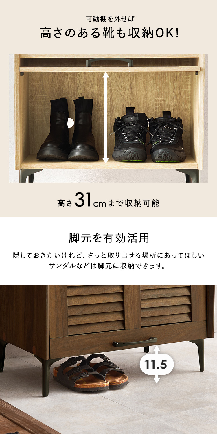 可動棚付きで大きめの靴も収納でき、スッキリとしたスチール脚はリビングの収納としてもおしゃれに使えます。