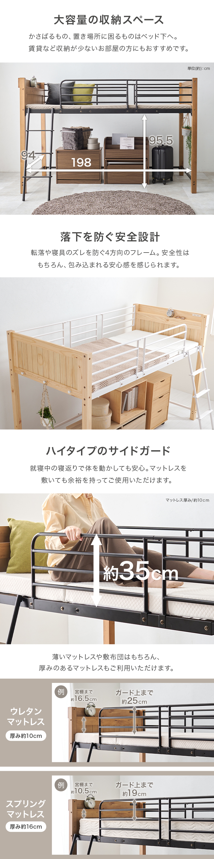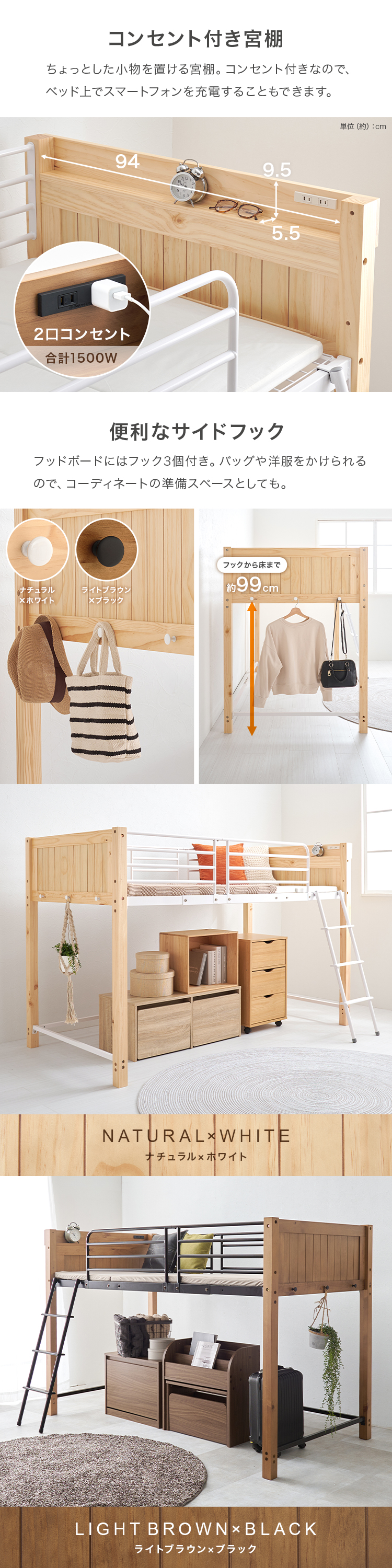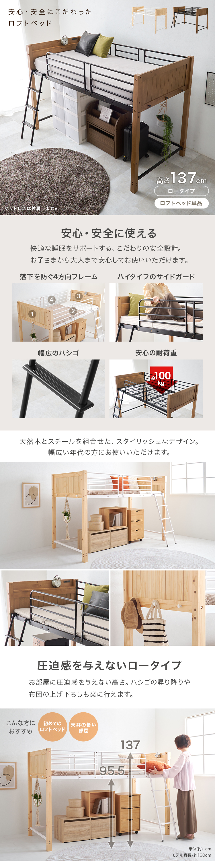 【商品説明】天然木とスチールを合わせたデザイン。ロフトベッドとしては低めの設計なので圧迫感が少なく上り下りもしやすい高さです。★お客様組立★※こちらの商品はお取り寄せ商品のため、初期不良以外の返品・交換は承れませんので、あらかじめご了承ください。【商品仕様】●商品サイズ(cm)幅約105.5×奥行約213×高さ約137●商品重量約50kg●主材パイン・スチール●組立の有無有り●組立時間180分(2名)