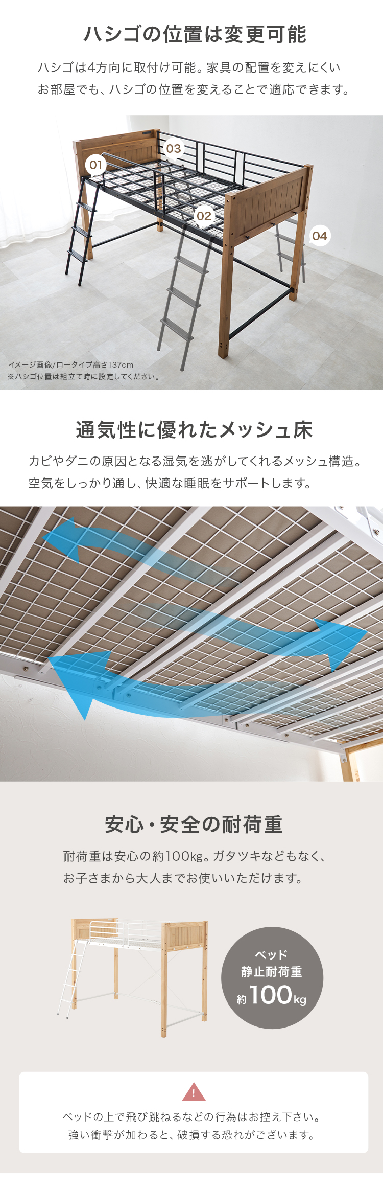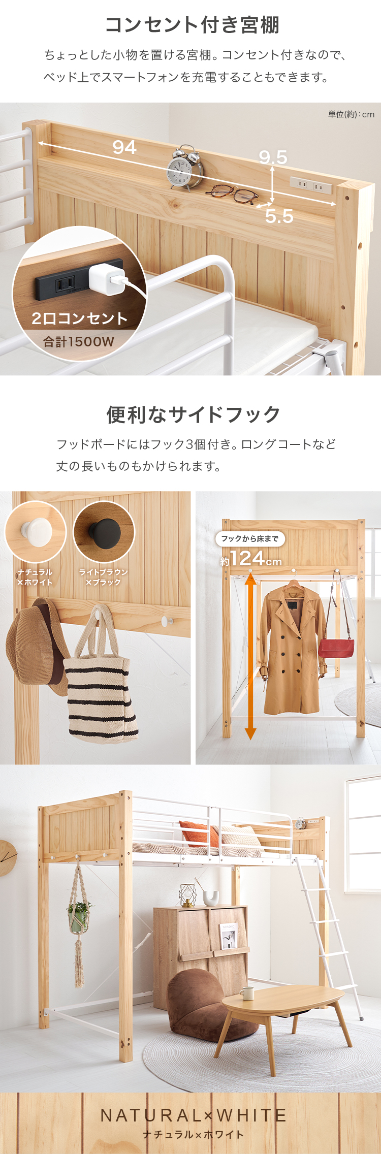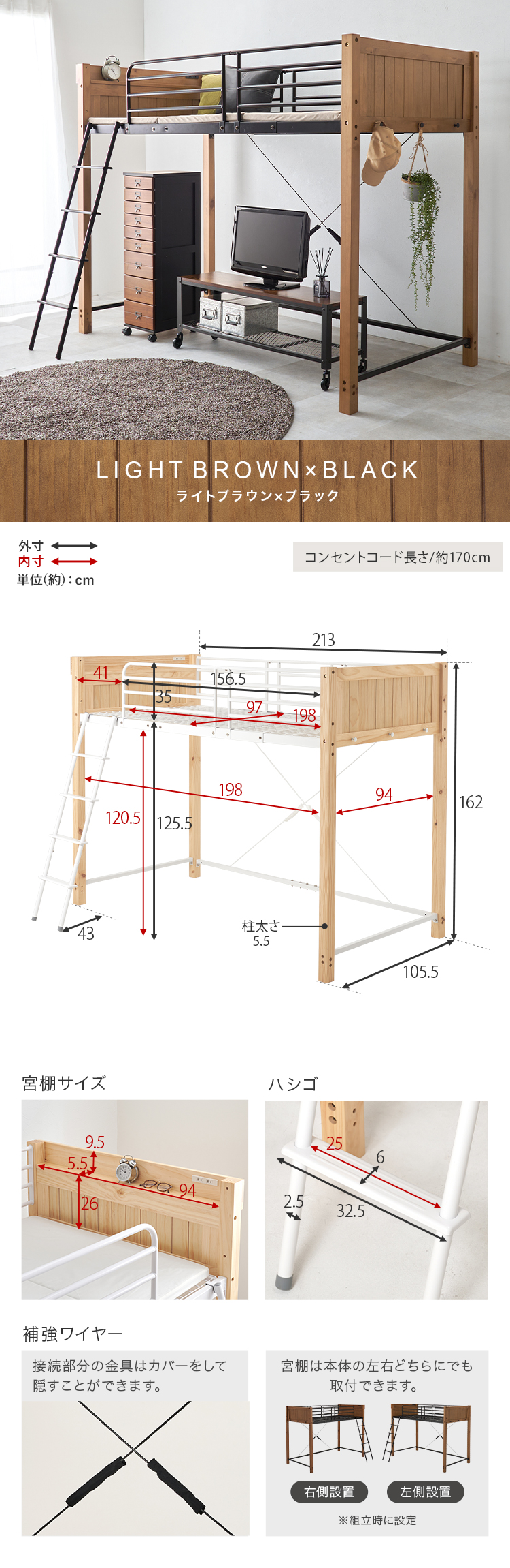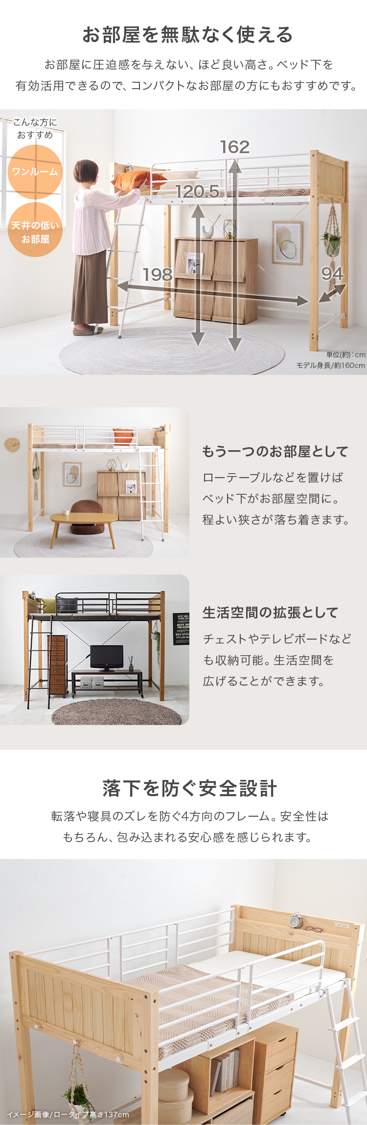 【商品説明】天然木とスチールを合わせたデザイン。床面下の空間を有効活用し、お部屋を広く使える高さです。★お客様組立★※こちらの商品はお取り寄せ商品のため、初期不良以外の返品・交換は承れませんので、あらかじめご了承ください。【商品仕様】●商品サイズ(cm)幅約105.5×奥行約213×高さ約162●商品重量約54kg●主材パイン・スチール●組立の有無有り●組立時間180分(2名)