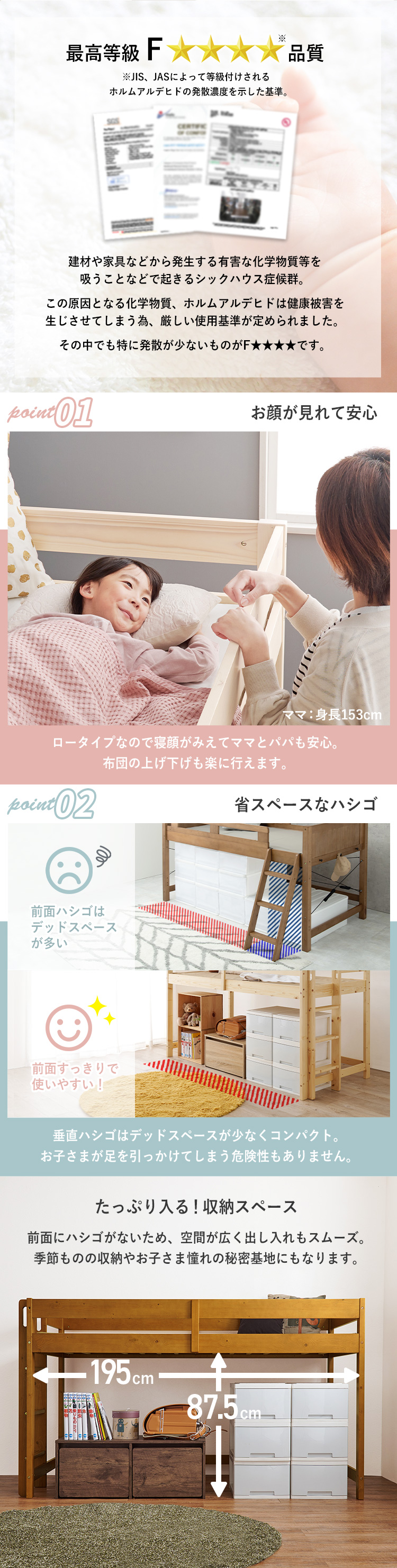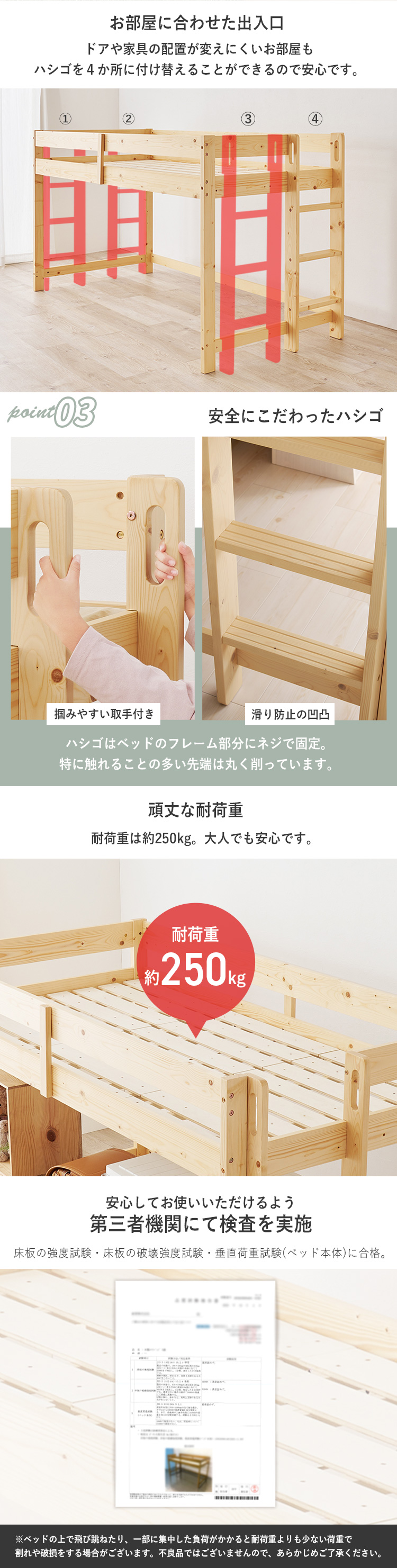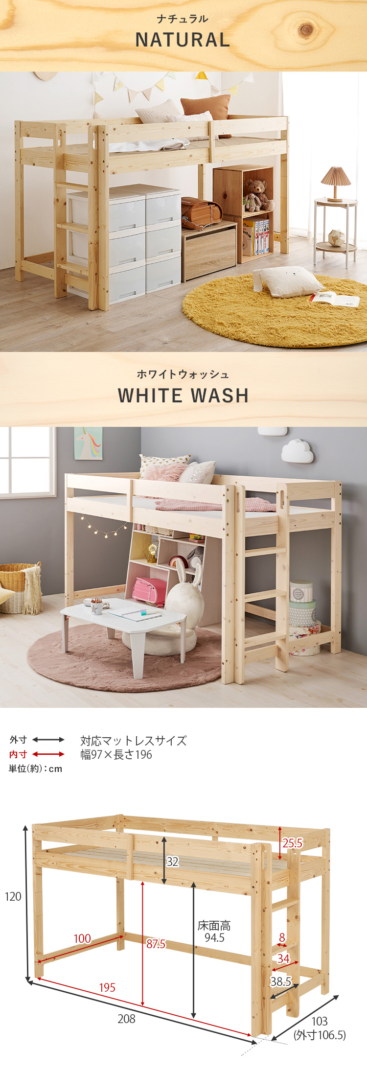 【商品説明】高さ120cmと低めなロフトベッド。床面下の収納も使いやすい省スペースな垂直のハシゴタイプです。★お客様組立★※こちらの商品はお取り寄せ商品のため、初期不良以外の返品・交換は承れませんので、あらかじめご了承ください。【商品仕様】●商品サイズ(cm)幅約106.5×奥行約208×高さ約120●商品重量約35kg●材質主材:パインスノコ:合板(LVL)●組立の有無有り●組立時間120分(2名)