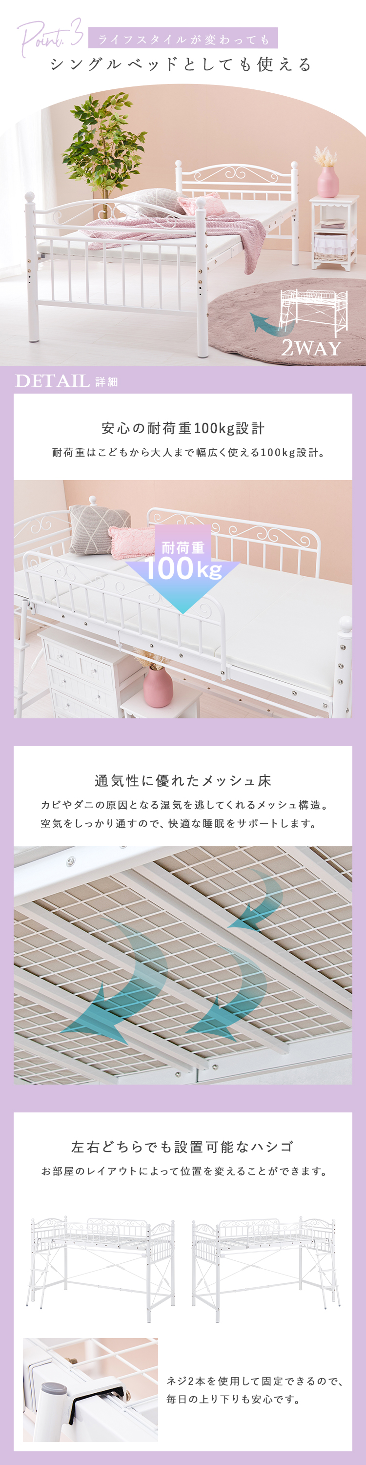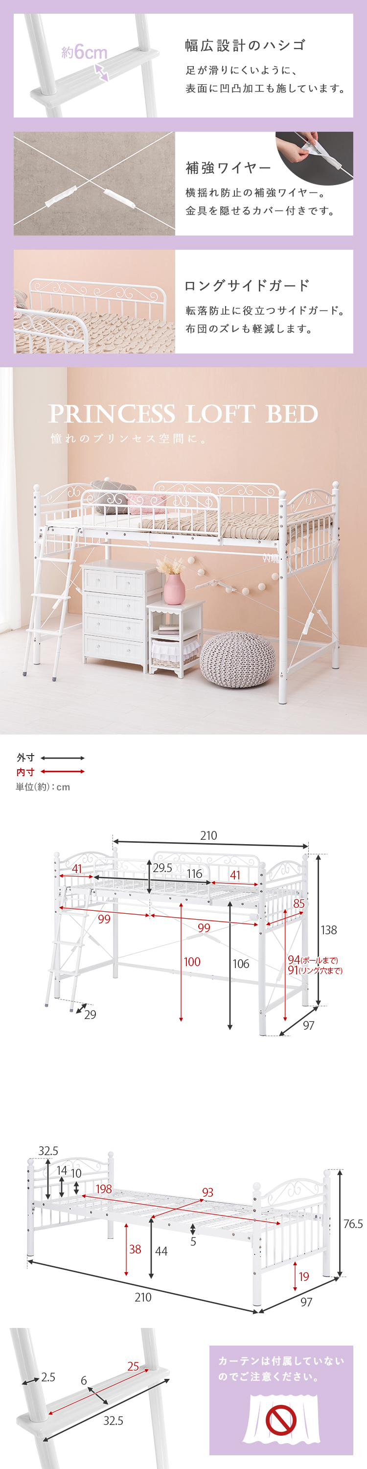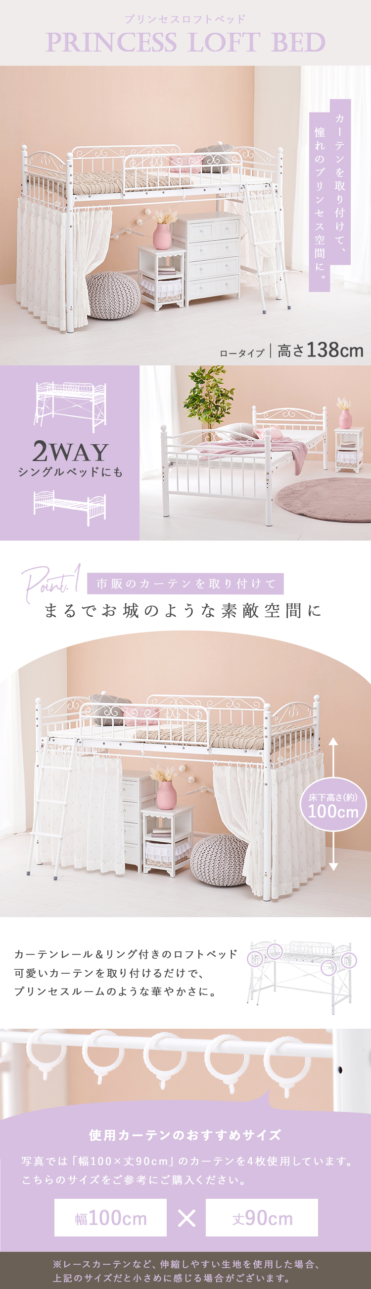 【商品説明】まるでプリンセスが住むお城のようなエレガントなデザインのパイプロフトベッドです。市販のカーテンを取り付けて使え、小物などの収納スペースも確保できるロータイプ。★お客様組立★※こちらの商品はお取り寄せ商品のため、初期不良以外の返品・交換は承れませんので、あらかじめご了承ください。【商品仕様】●商品サイズ(cm)幅約97×奥行約210×高さ約138●商品重量約51kg●主材スチールパイプ●組立の有無有り●組立時間180分(2名)