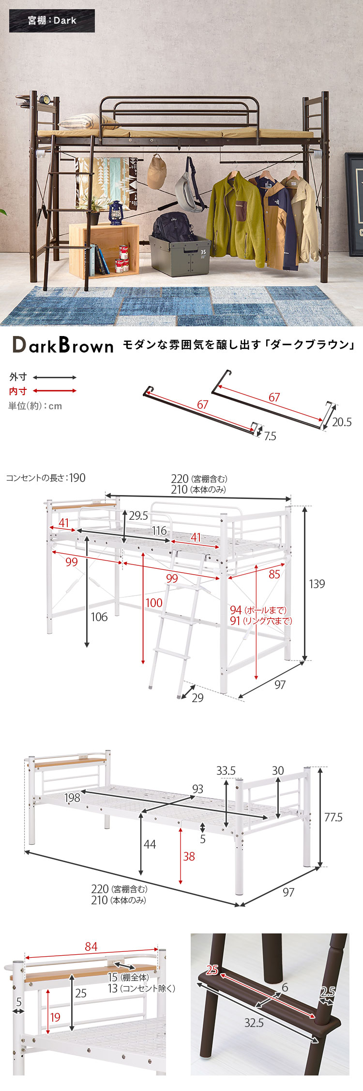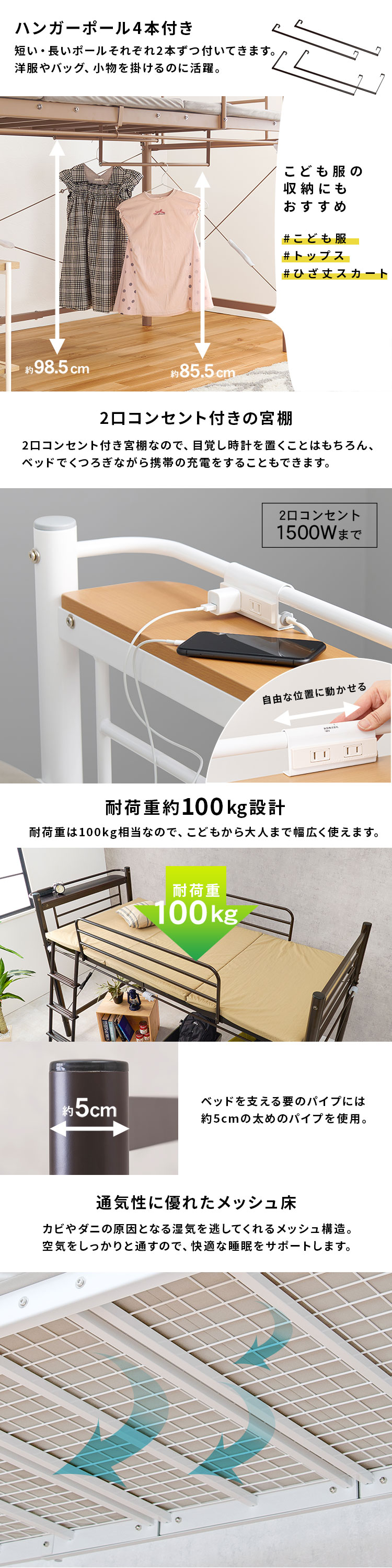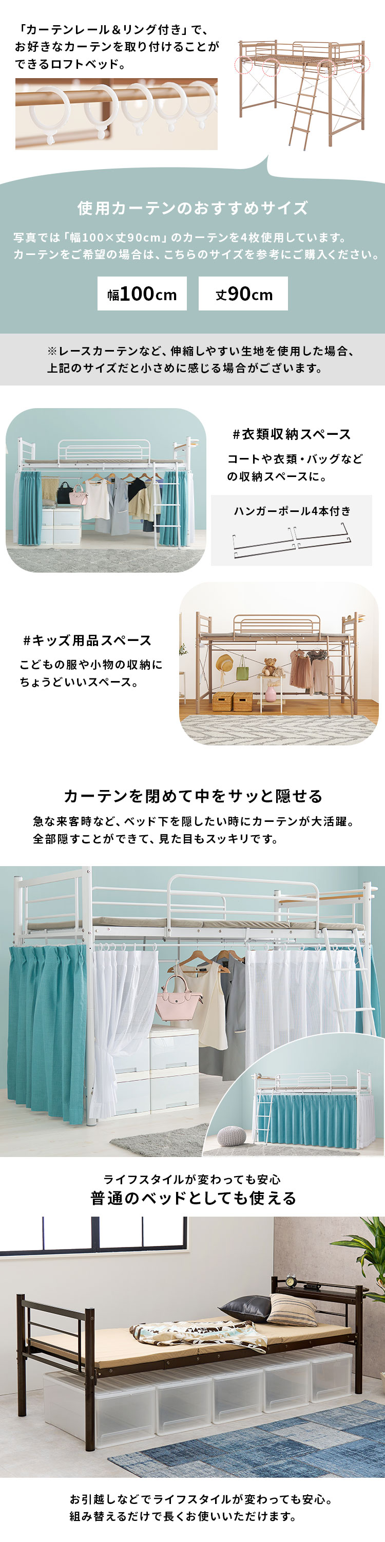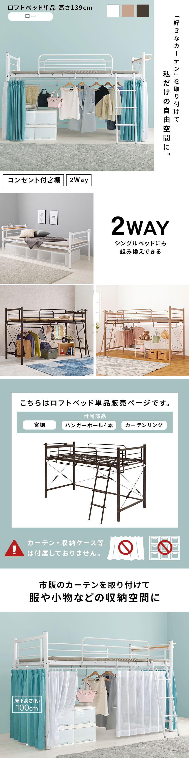 【商品説明】ベッド下の空間に市販のカーテンを取り付け可能なパイプロフトベッド。ハンガーポールもついているので衣類収納としても活躍。床面が高すぎず、小物などの収納スペースも確保できるロータイプ。★お客様組立★※こちらの商品はお取り寄せ商品のため、初期不良以外の返品・交換は承れませんので、あらかじめご了承ください。【商品仕様】●商品サイズ(cm)幅約97×奥行約220×高さ約139/77.5●商品重量約54kg●主材スチールパイプ●組立の有無有り●組立時間180分(2名)