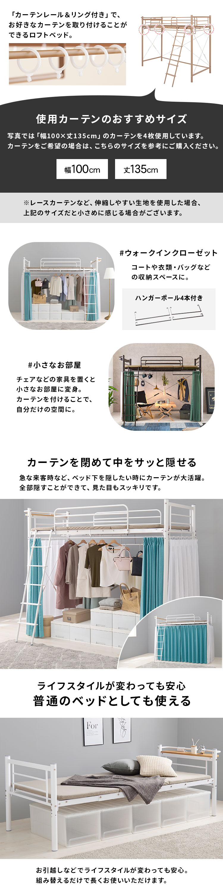 ベッド下の空間に市販のカーテンを取り付け可能なパイプロフトベッド。