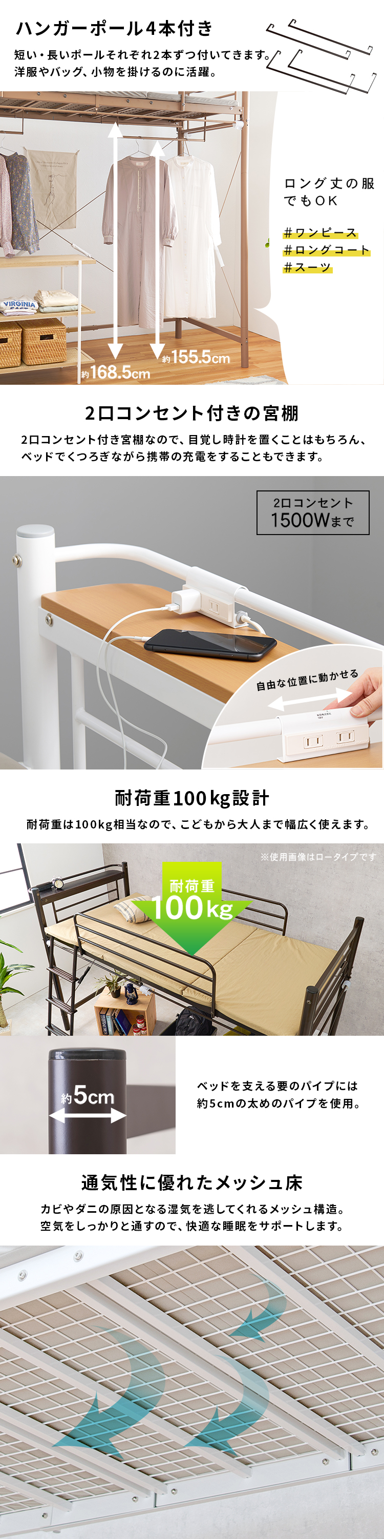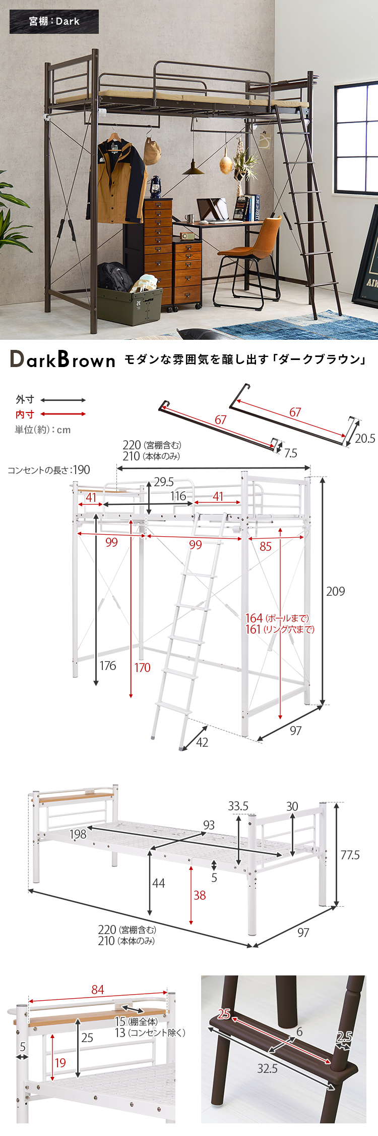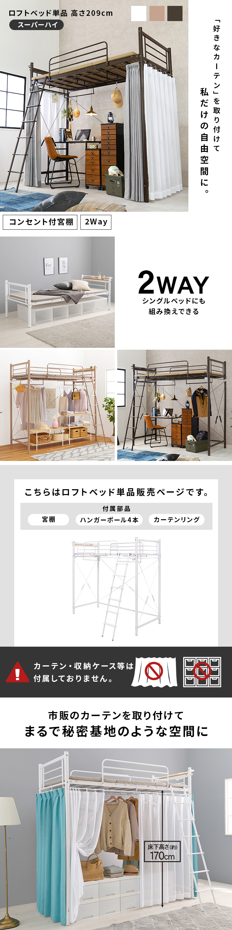 【商品説明】ベッド下の空間に市販のカーテンを取り付け可能なパイプロフトベッド。ハンガーポールもついているので衣類収納としても活躍。ベッド下の空間がウォークインクローゼットや小さなお部屋として使えるスーパーハイタイプ。★お客様組立★※こちらの商品はお取り寄せ商品のため、初期不良以外の返品・交換は承れませんので、あらかじめご了承ください。【商品仕様】●商品サイズ(cm)幅約97×奥行約220×高さ約209/77.5●商品重量約59kg●主材スチールパイプ●組立の有無有り●組立時間180分(2名)