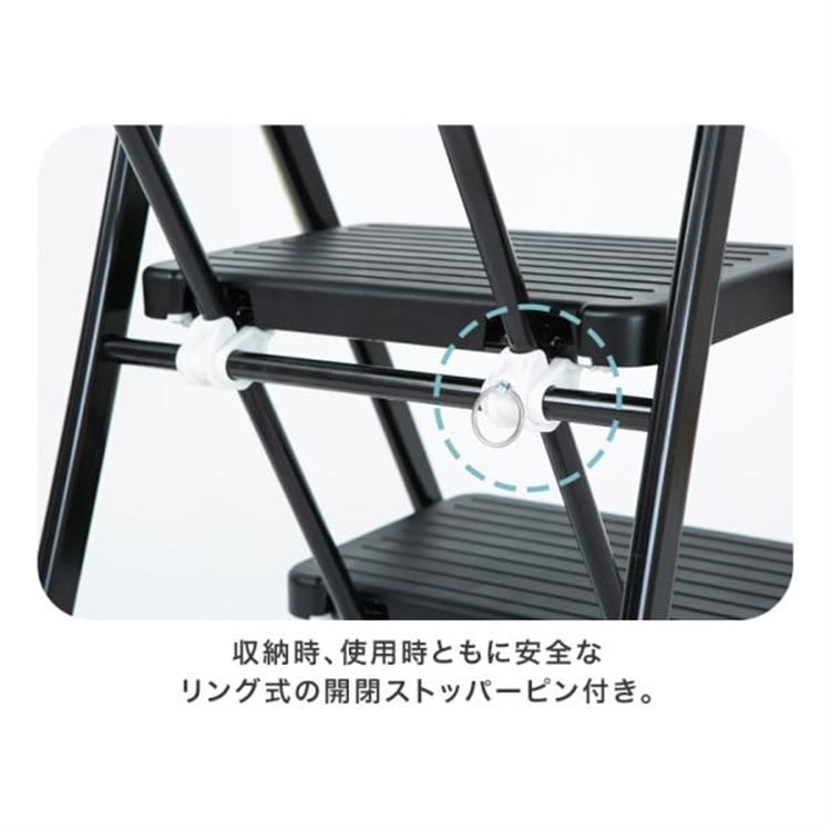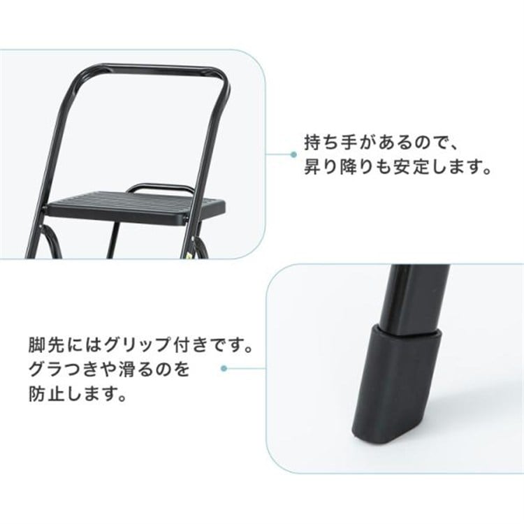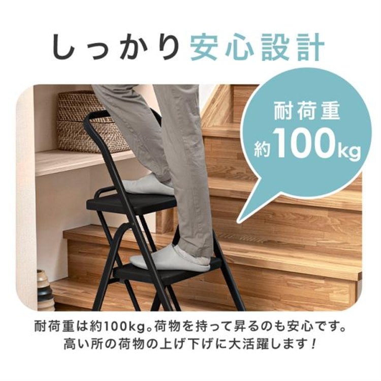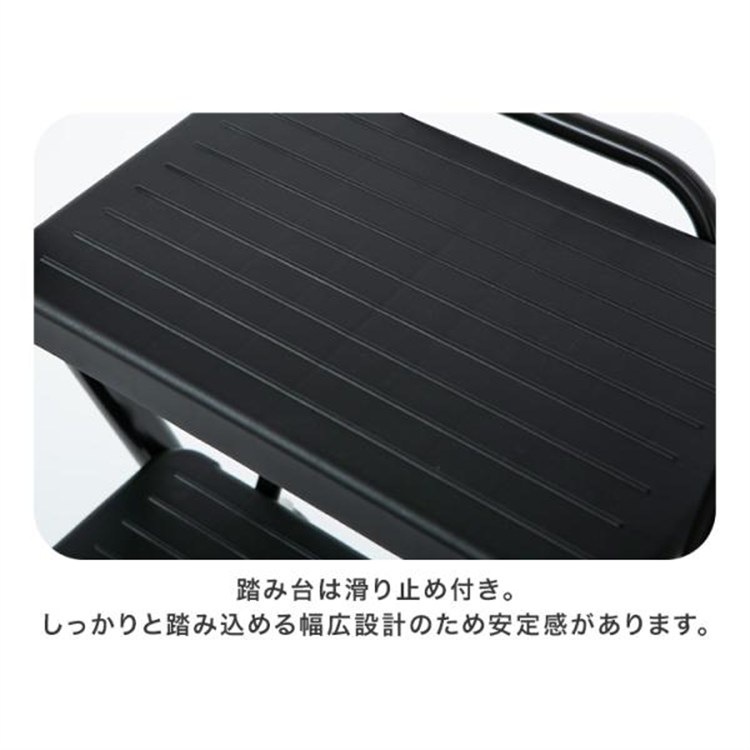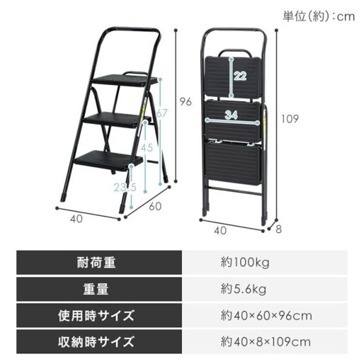 ●商品サイズ(cm)使用時:幅約40×奥行約60×高さ約96収納時:幅約40×奥行約8×高さ約109ステップ高さ:1段目約23.5/2段目約45/3段目約67ステップ寸法:幅約34×奥行約22●商品重量約5.64kg●主要材質フレーム:スチール(エポキシ樹脂塗装)ステップ:ポリプロピレン