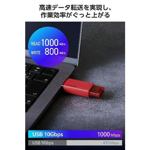 データ転送速度:読み込み:最大1000MB/s、書き込み:最大800MB/s ※当社環境での測定値 ※USB 10Gbps(USB3.2(Gen2))でご使用になるには、機器側がUSB 10Gbps(USB3.2(Gen2))に対応している必要があります。