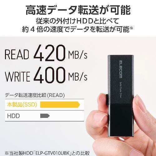 データ転送速度:読み込み:最大420MB/s、書き込み:最大400MB/s ※メーカー環境での測定値 ※USB 5Gbps(USB3.2(Gen1))でご使用になるには、機器側がUSB 5Gbps(USB3.2(Gen1))に対応している必要があります。