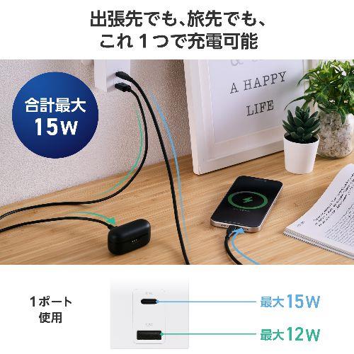 USB側定格出力(2ポート使用時):USB Type-Cポート+USB-Aポート:合計15W(5V/3A)(USB Type-C 15W(5V/3A)、USB-A 12W(5V/2.4A))
