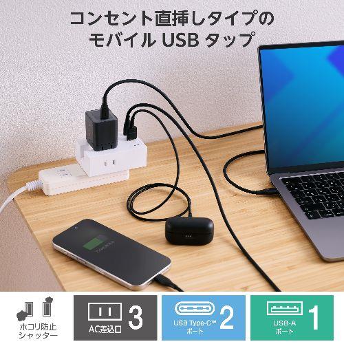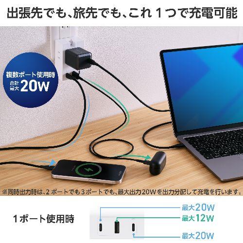 USB側定格出力(3ポート使用時):USB Type-Cポート+USB Type-Cポート+USB-Aポート:合計20W(5V/4A)(各USB Type-C 15W(5V/3A)、USB-A 12W(5V/2.4A))
