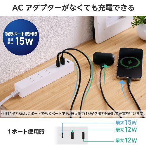 USB側定格出力(3ポート使用時):USB Type-Cポート+USB-Aポート+USB-Aポート:合計15W(5V/3A)(USB Type-C 15W(5V/3A)、各USB-A 12W(5V/2.4A))